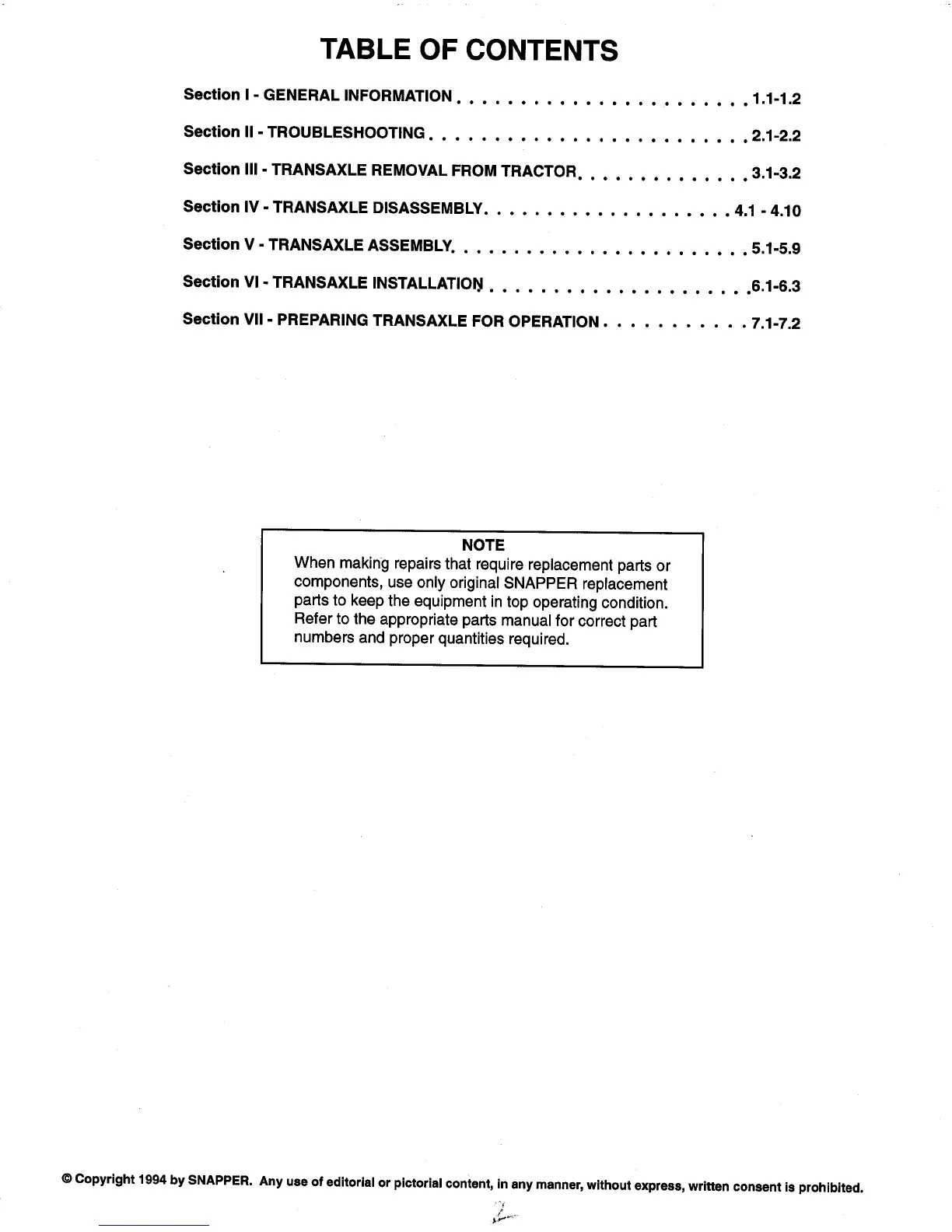 Snapper K50 - Table of Contents