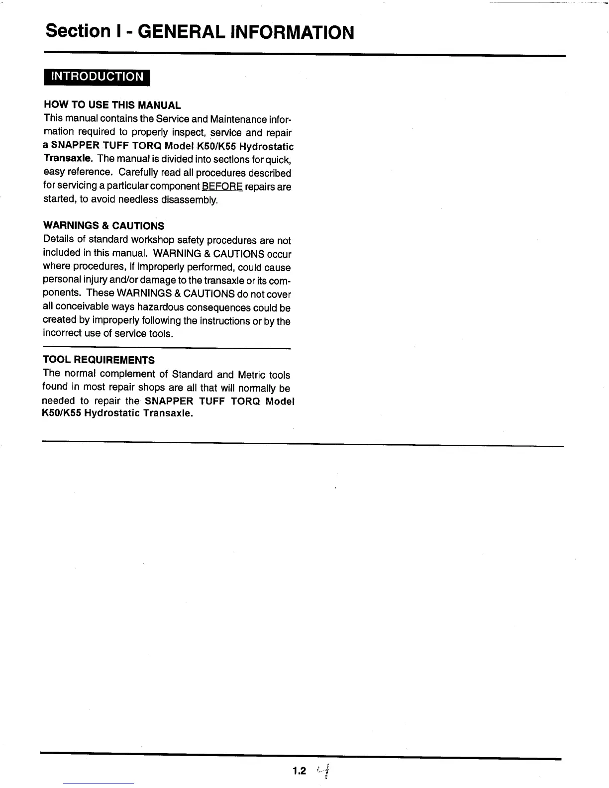 Snapper K50 - Warnings & Cautions; Tool Requirements