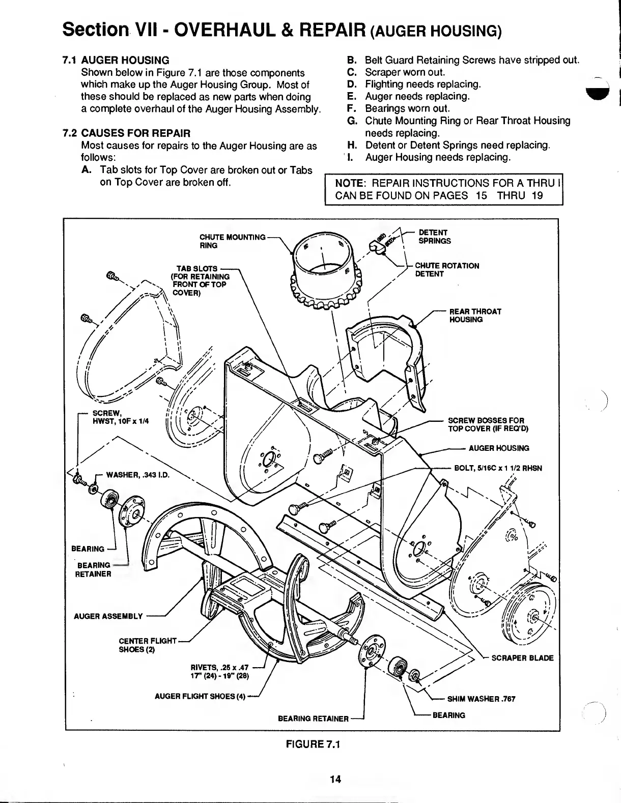 Snapper LE317 - Section VII - OVERHAUL & REPAIR (AUGER HOUSING); Auger Housing Components; Causes for Repair