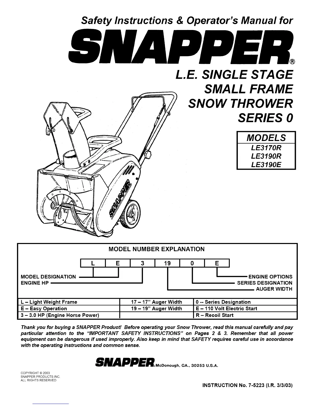 Thank you for buying a SNAPPER Product! Before operating your Snow Thrower, read this manual carefully and pay