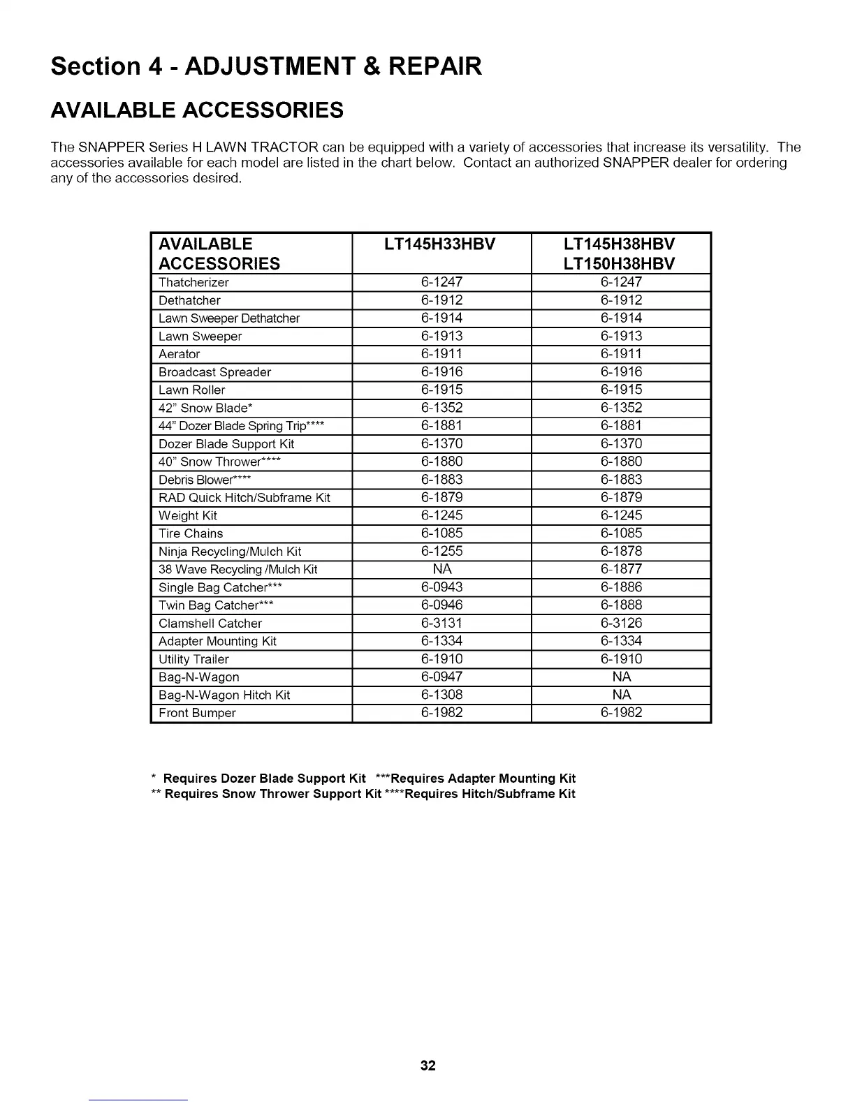 accessories available for each model are listed in the chart below. Contact an authorized SNAPPER dealer for ordering