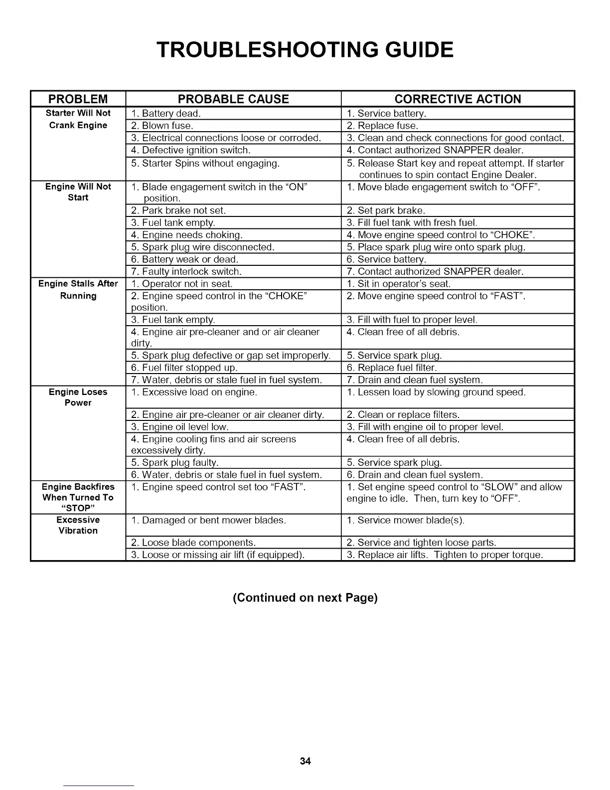 4. Defective ignition switch. 4. Contact authorized SNAPPER dealer.