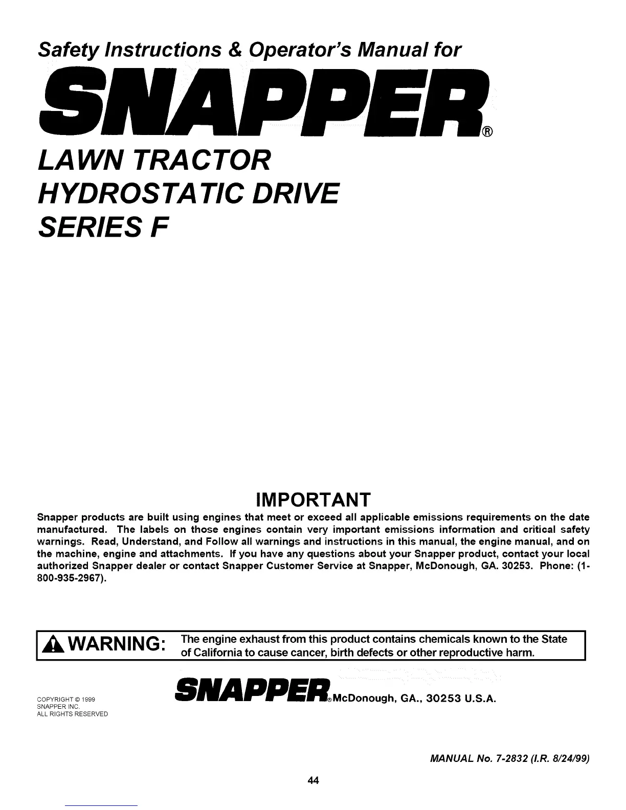 authorized Snapper dealer or contact Snapper Customer Service at Snapper, McDonough, GA. 30253. Phone: (1-