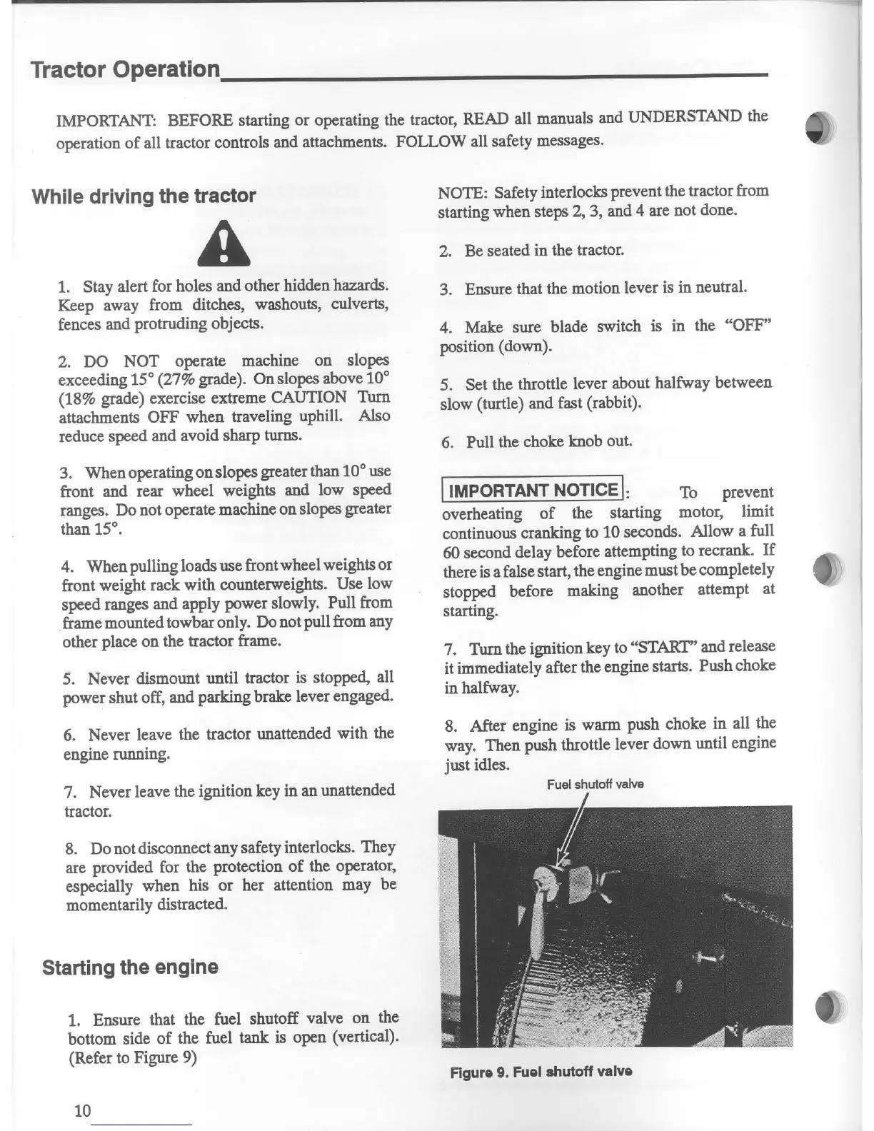 Snapper MGT2000H - Tractor Operation; While Driving the Tractor; Starting the Engine