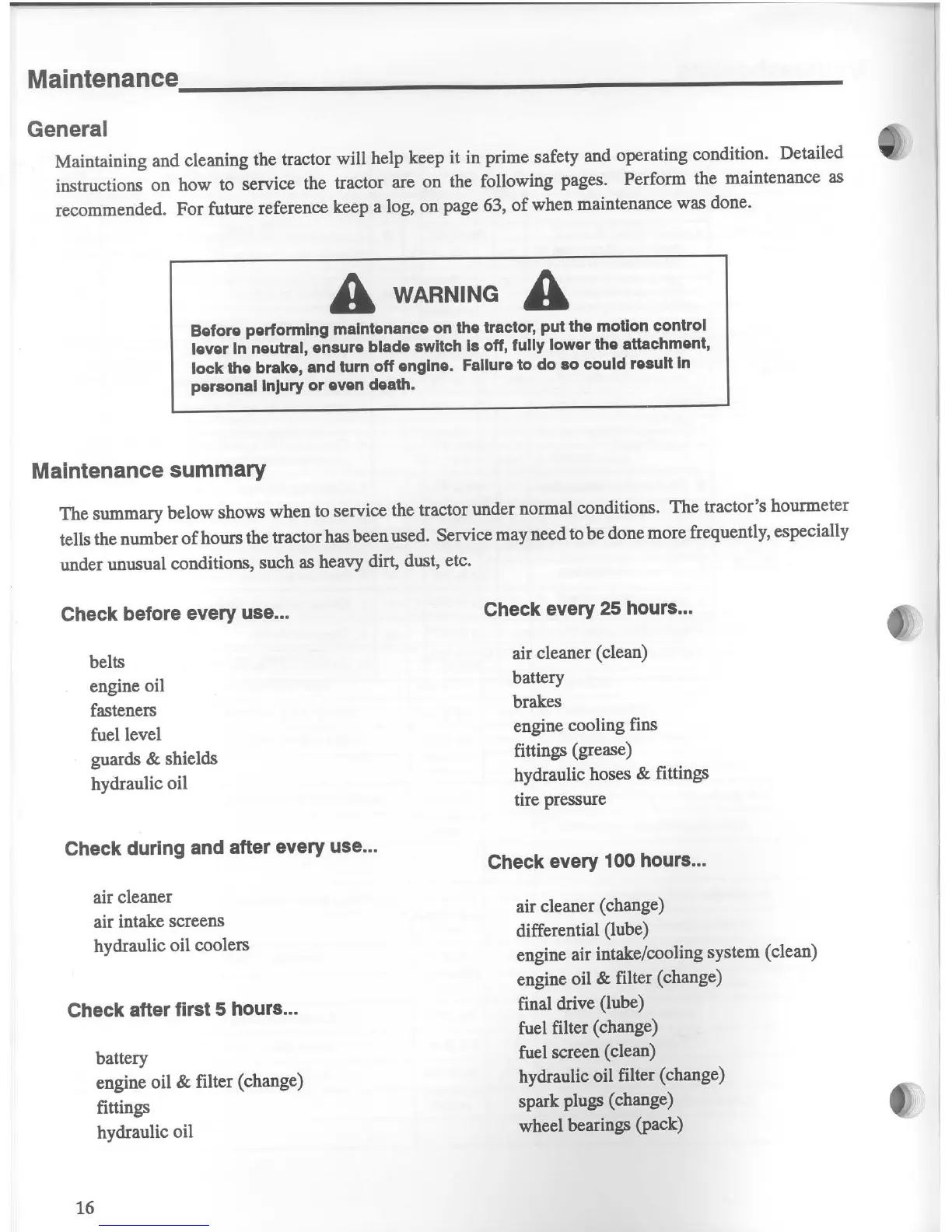 Snapper MGT2000H - Maintenance; General; Maintenance Summary