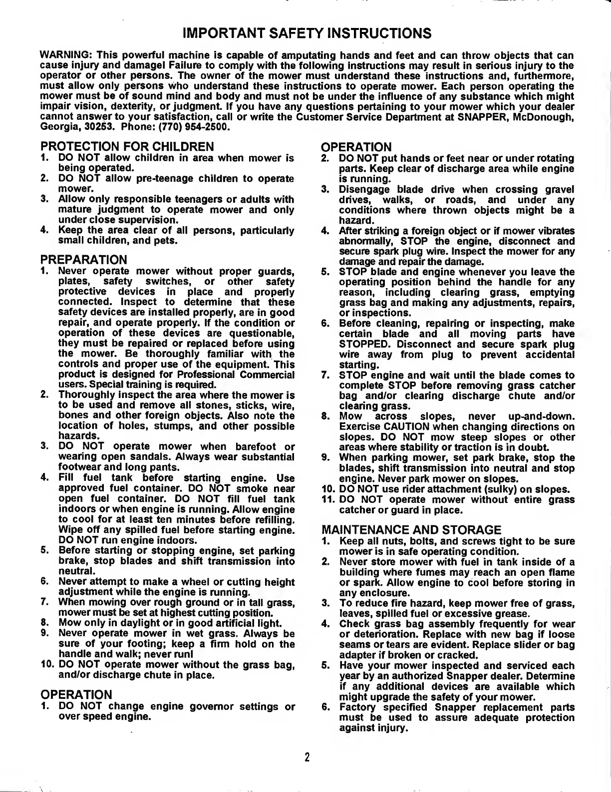 Snapper PRO GEAR 0 Series - Important Safety Instructions; Operation