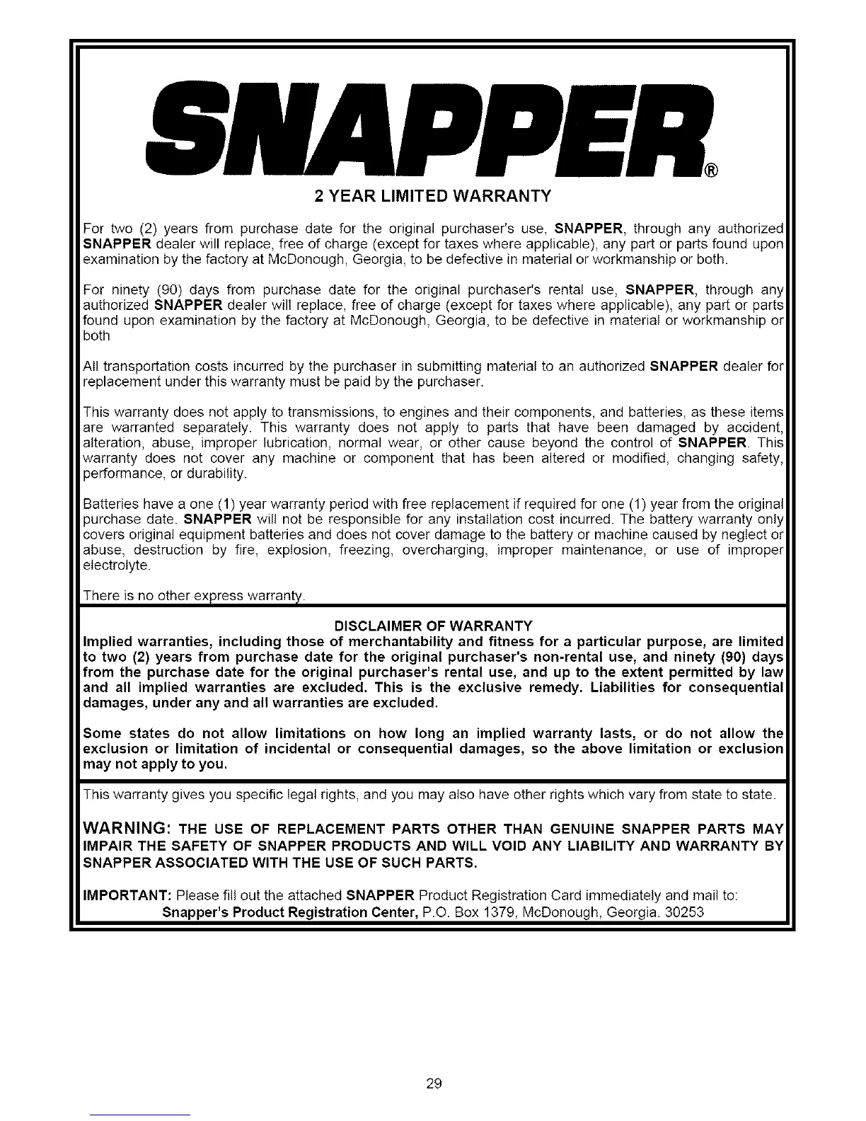 IMPORTANT: Please fill out the attached SNAPPER Product Registration Card immediately and mail to:
