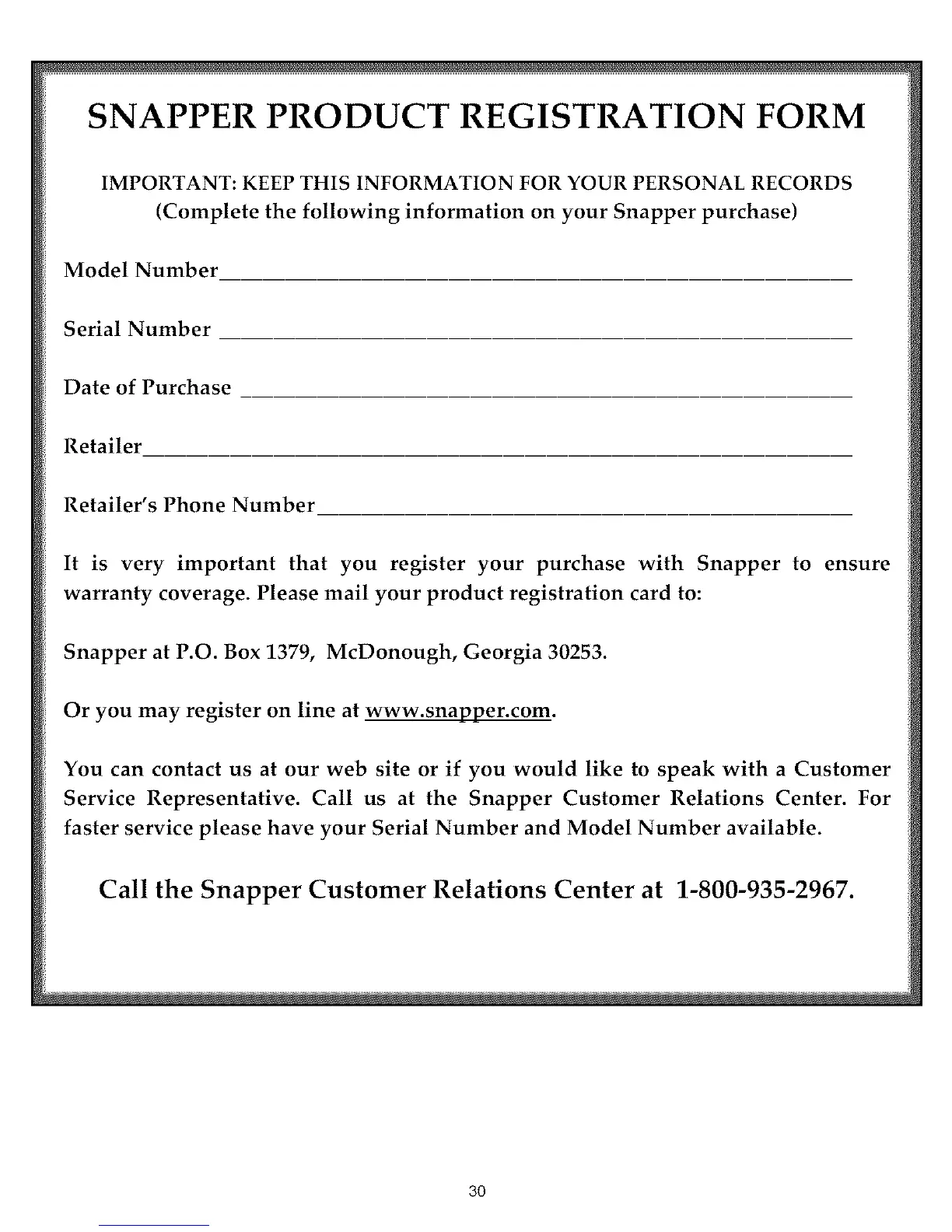 Service Representative. Call us at the Snapper Customer Relations Center. For