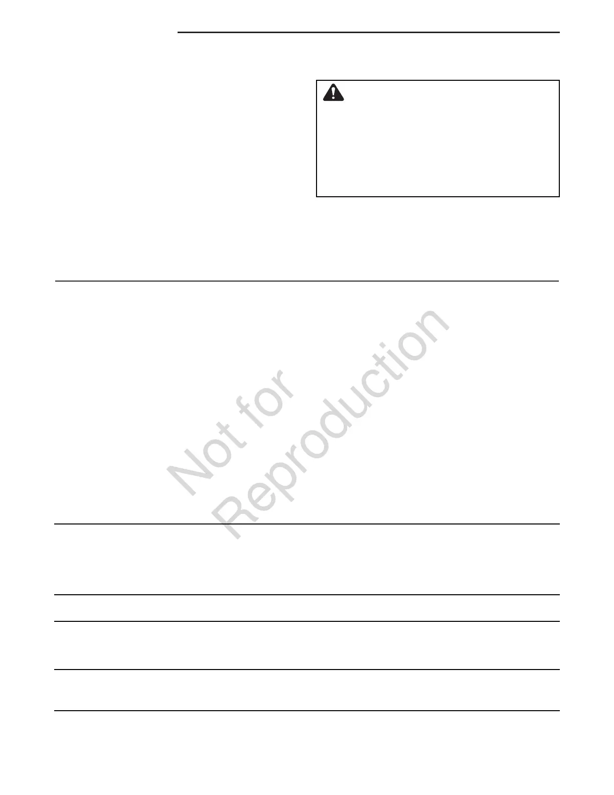 Engine will not turnover or start. 1. Parking brake not engaged. 1. Engage parking brake.