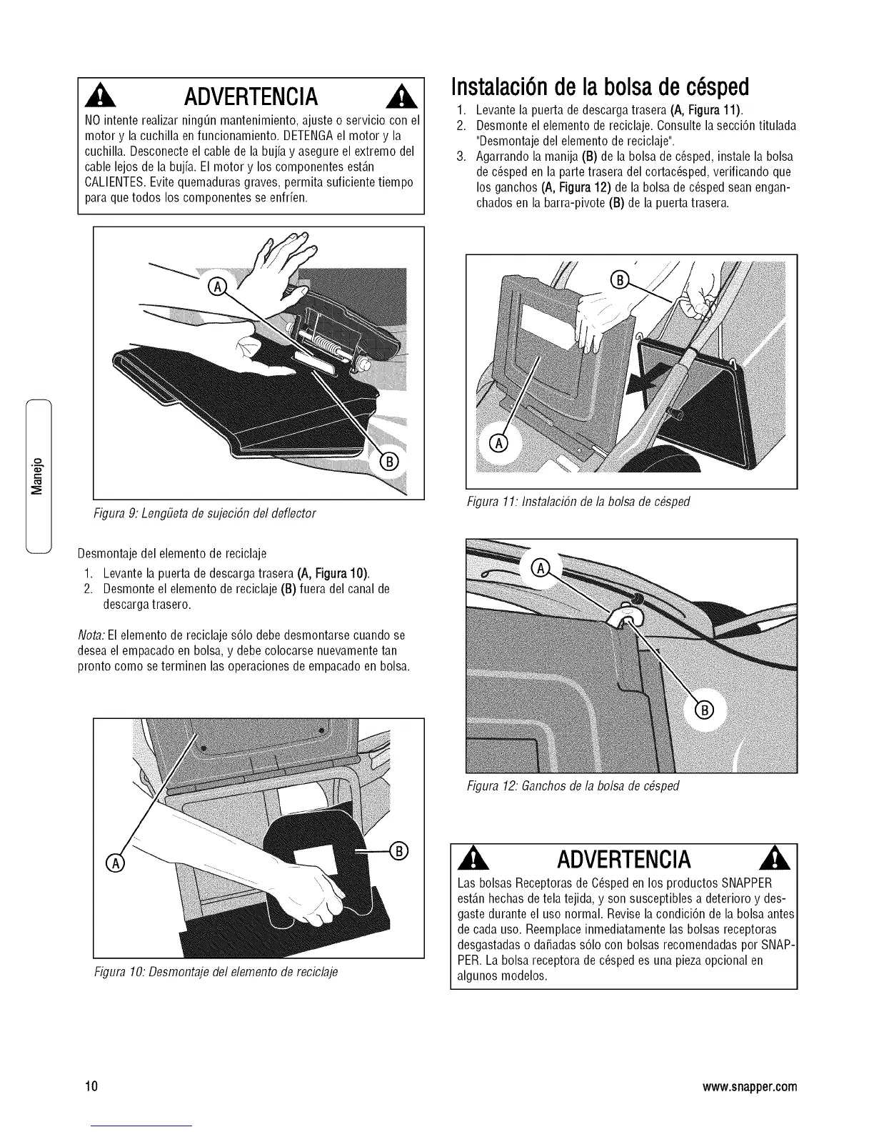 3. Agarrando la manija (B) de la bolsa de c6sped, instale la bolsa