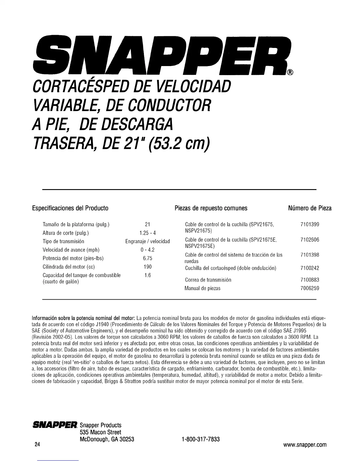 ciones de fabricaci6n y capacidad, Briggs & Stratton podria sustituir motor de mayor potencia nominal por el motor de esta Serie.