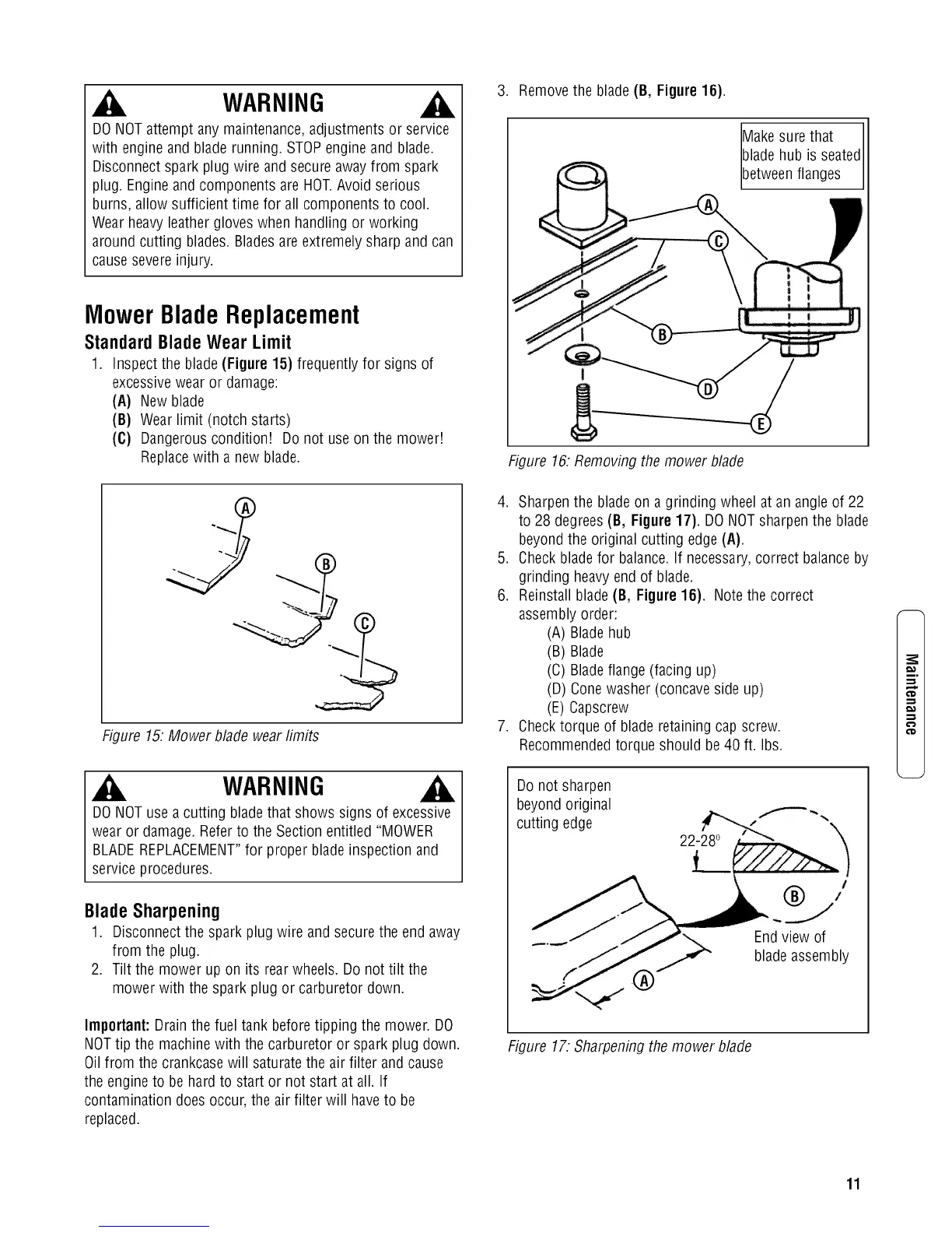 6. Reinstall blade(B, Figure 16). Note the correct