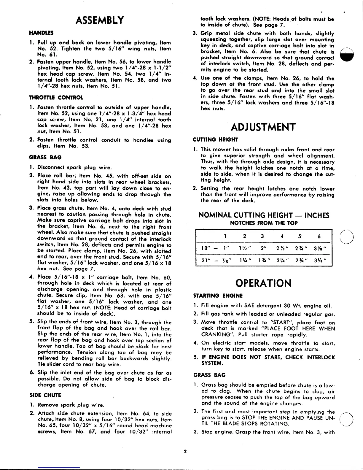 Snapper SV182 - Assembly; Adjustment; Side Chute; Starting Engine