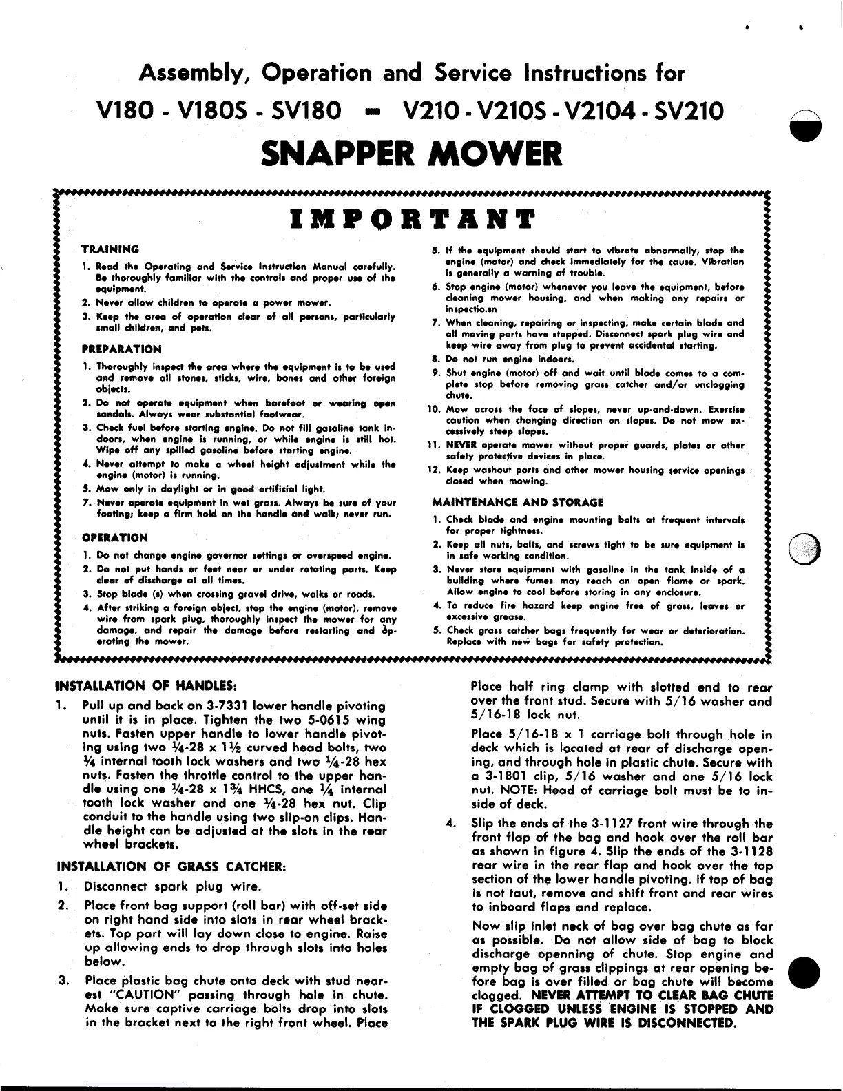 Snapper SV182 - Training; Preparation; Operation; Installation of Handles