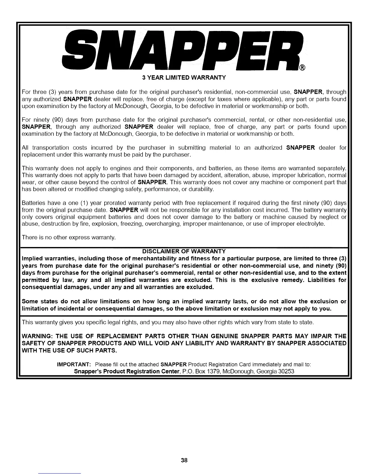 IMPORTANT: Pleasefill out the attached SNAPPER Product Registration Card immediately and mailto:
