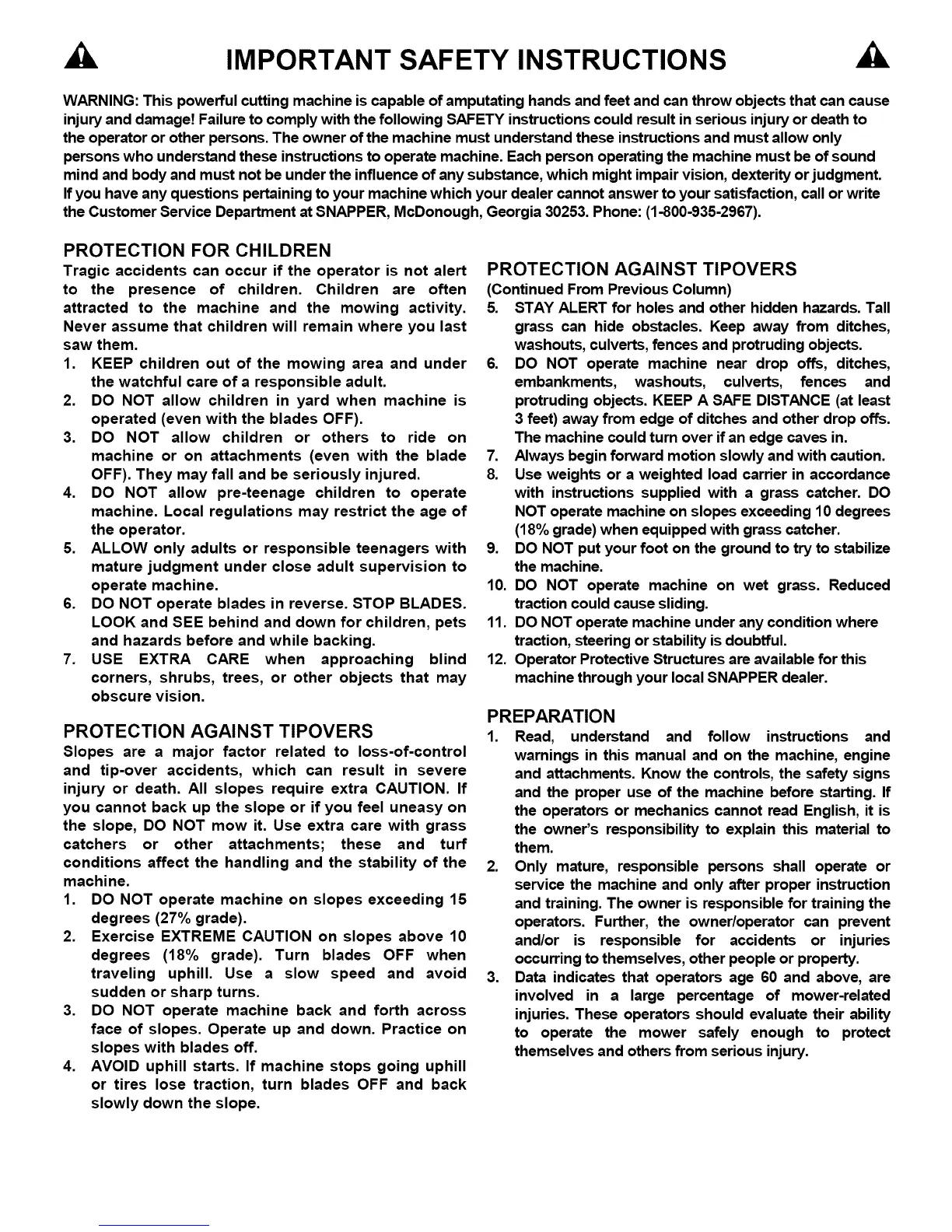 the Customer Service Department at SNAPPER, McDonough, Georgia 30253. Phone: (1-800-935-2967).