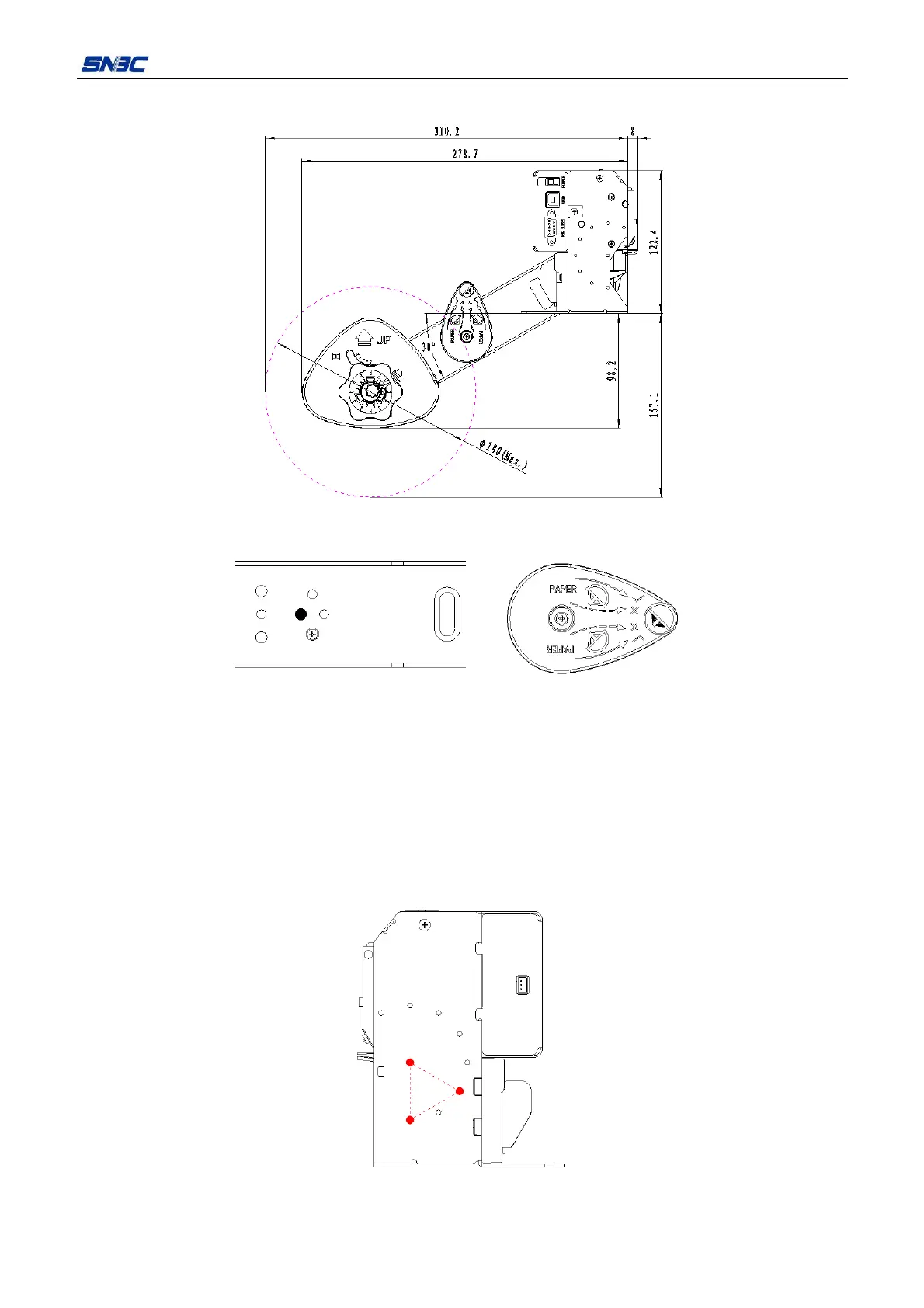 relative position of the print mechanism to fixing holes marked by solid circle and the extreme size after