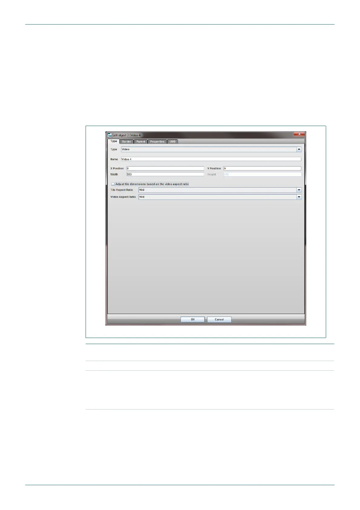The Edit Object menu comprises 4 tabs: Type, Border, Parent, Properties and UMD. Some