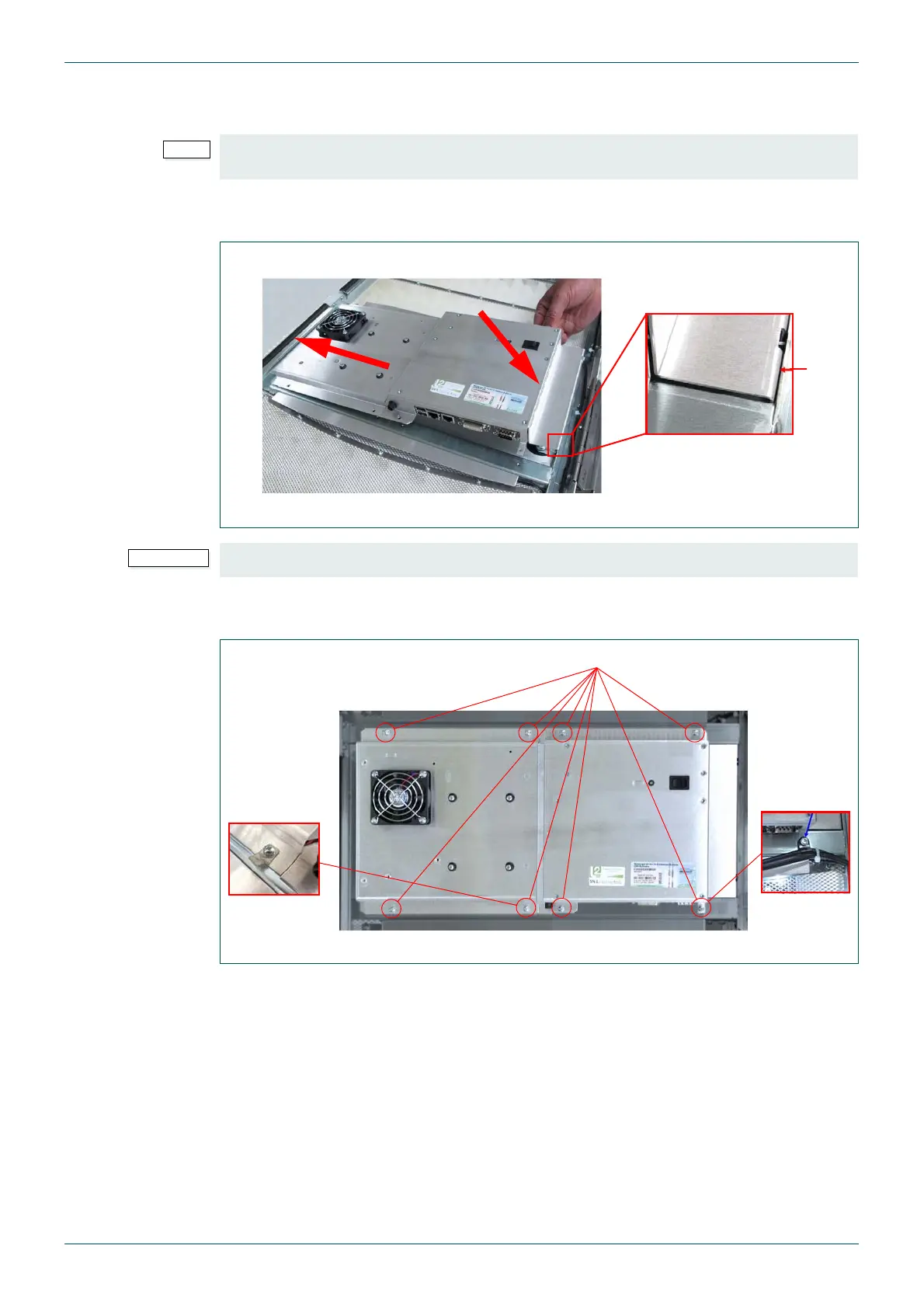 9. Refit the 8 x M3 x 10 mm screws (see Fig 48.). Make sure the spade connector and