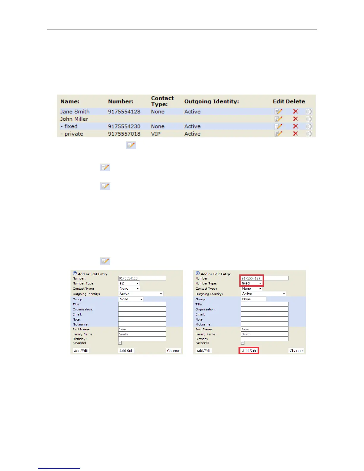 - Click on in a phone number's line if you wish to edit the subentry`s data (phone number,