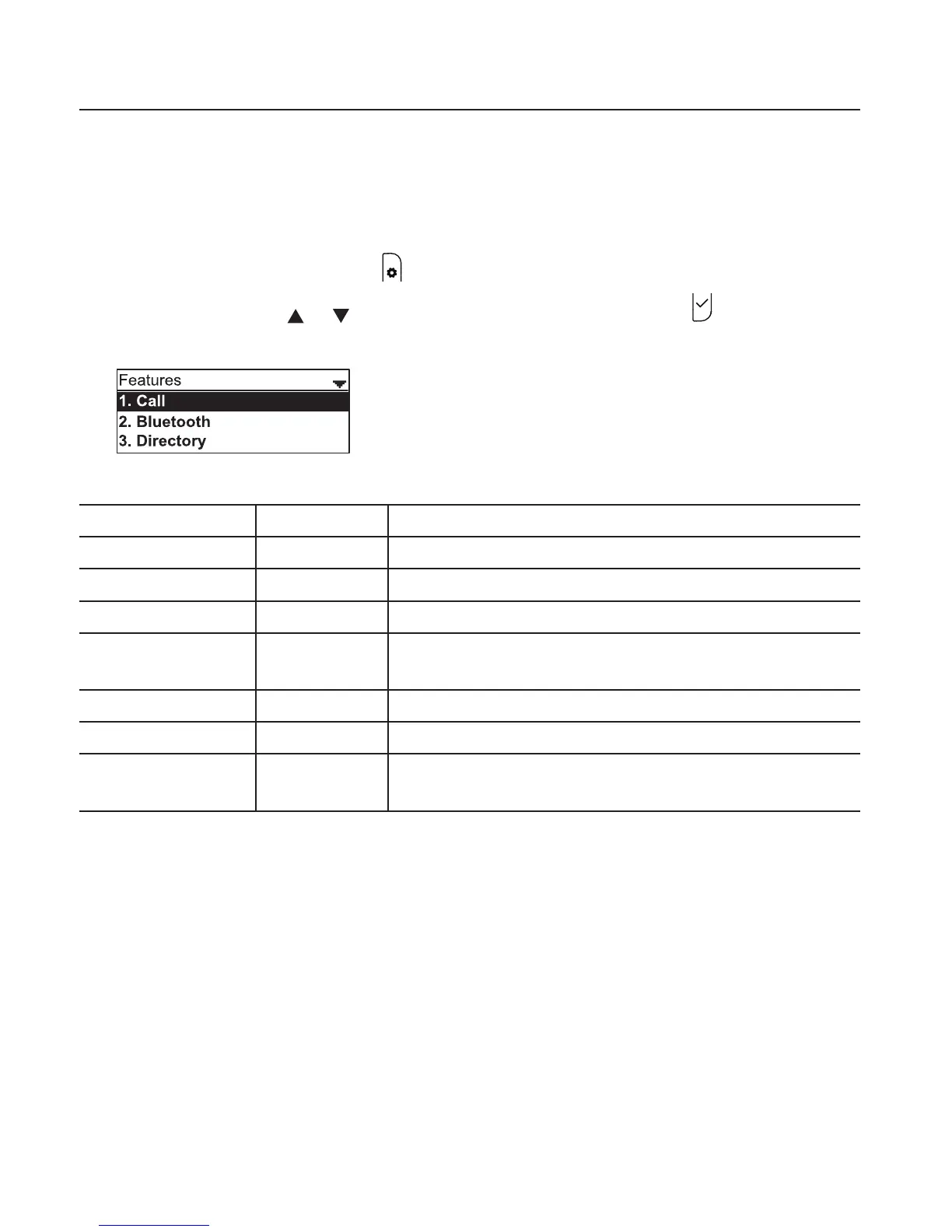 On the Features menu, you can manage incoming calls, Bluetooth devices, use the