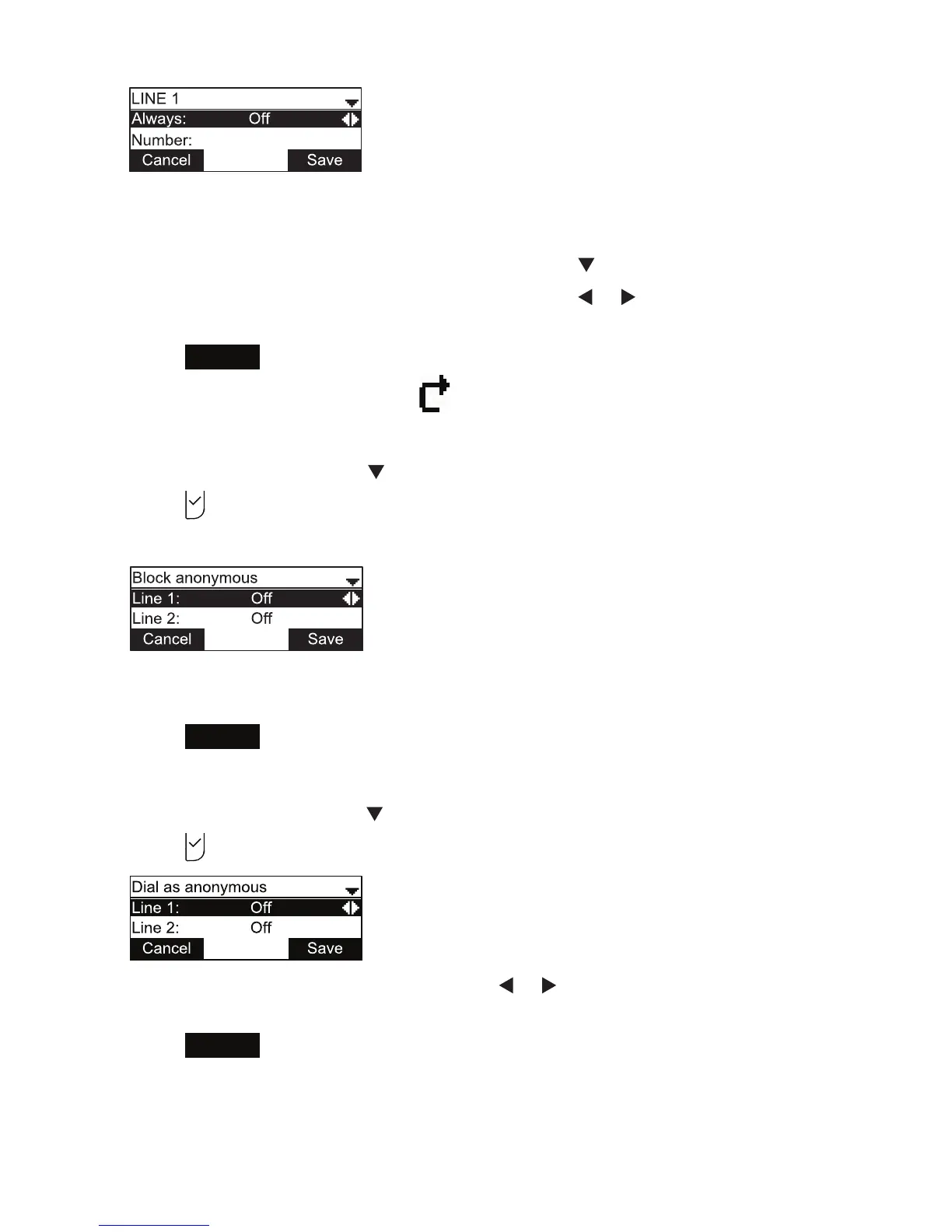 3. Highlight the desired line, and then press t or u to turn anonymous call blocking