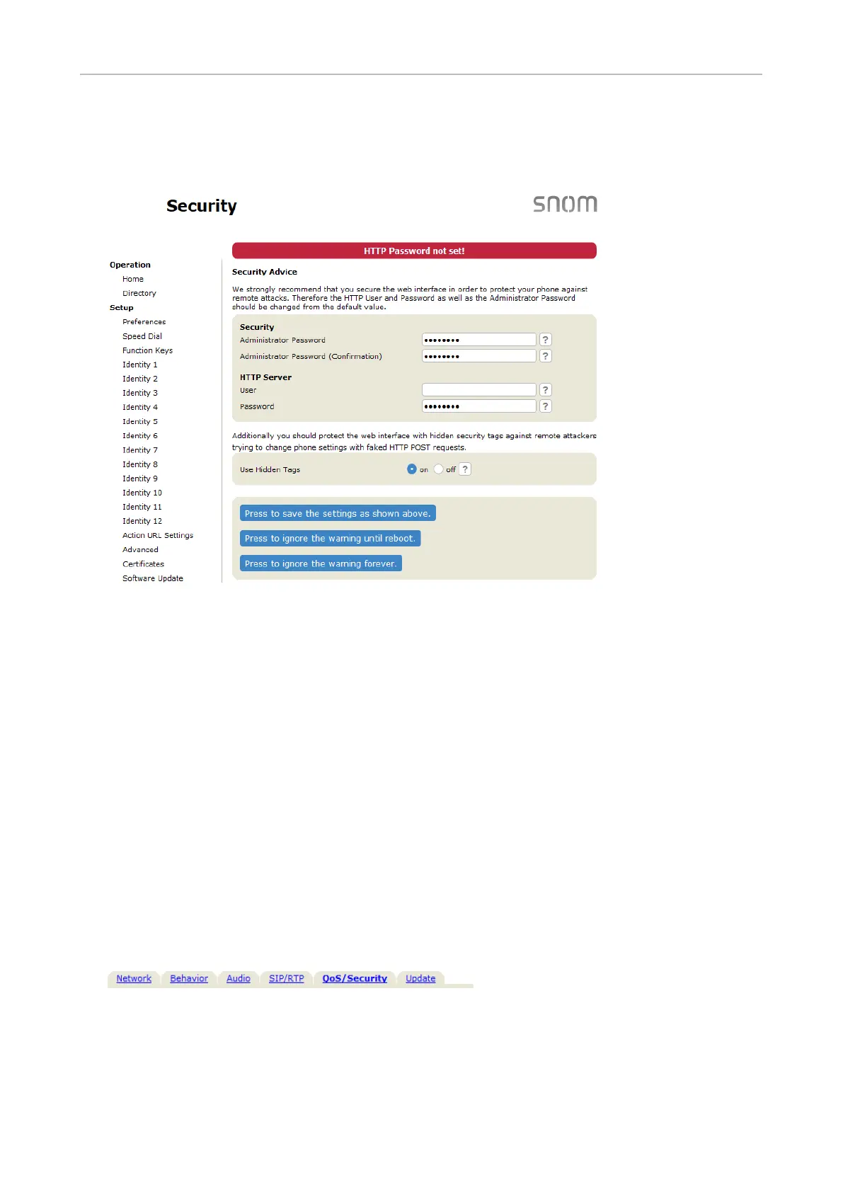 We urge you to set administrator and HTTP passwords to protect your phone. The default