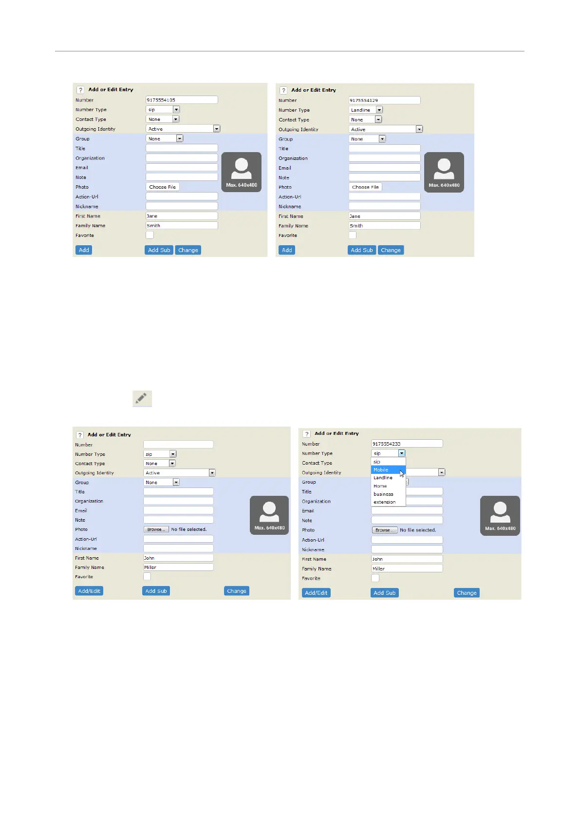 ◦ John Miller's entry has a SIP number and a private number. In this example, his cell phone