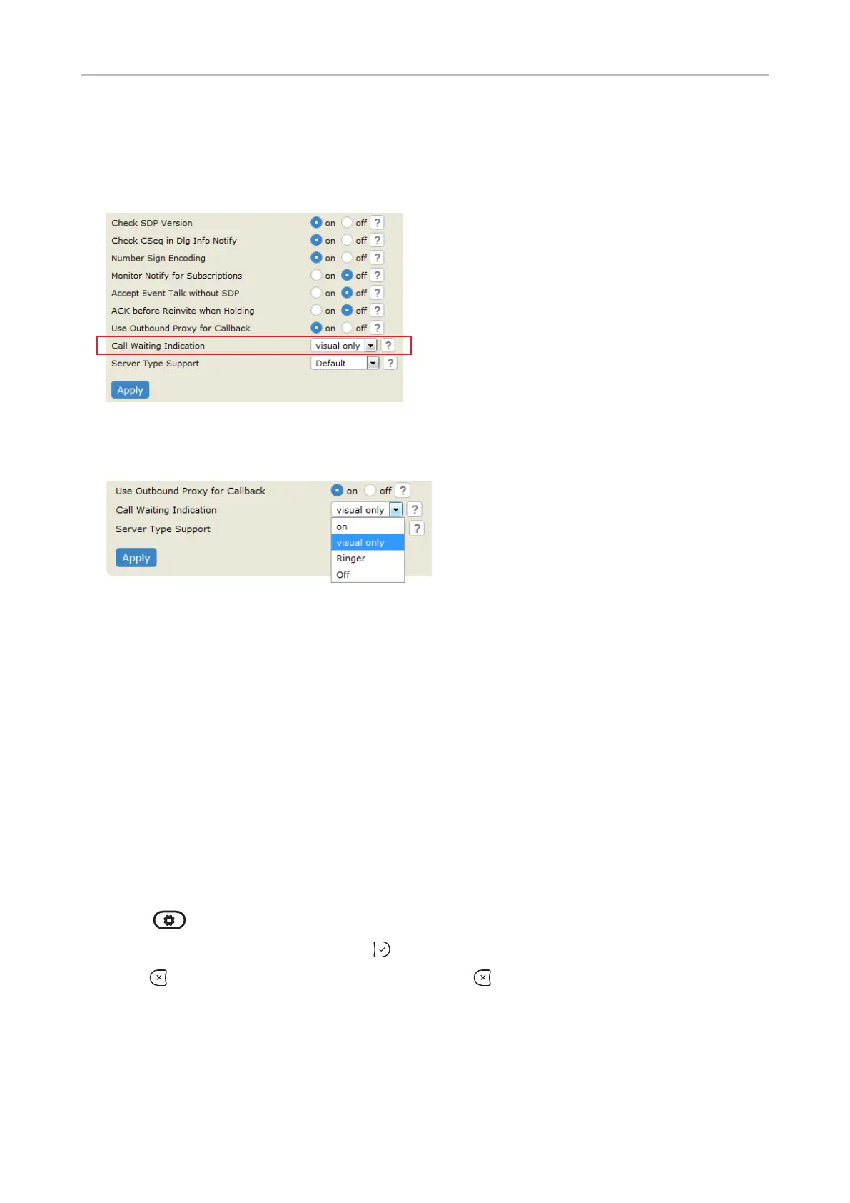 2. Click the SIP tab. The setting Call Waiting Indication is the second to last on the page.