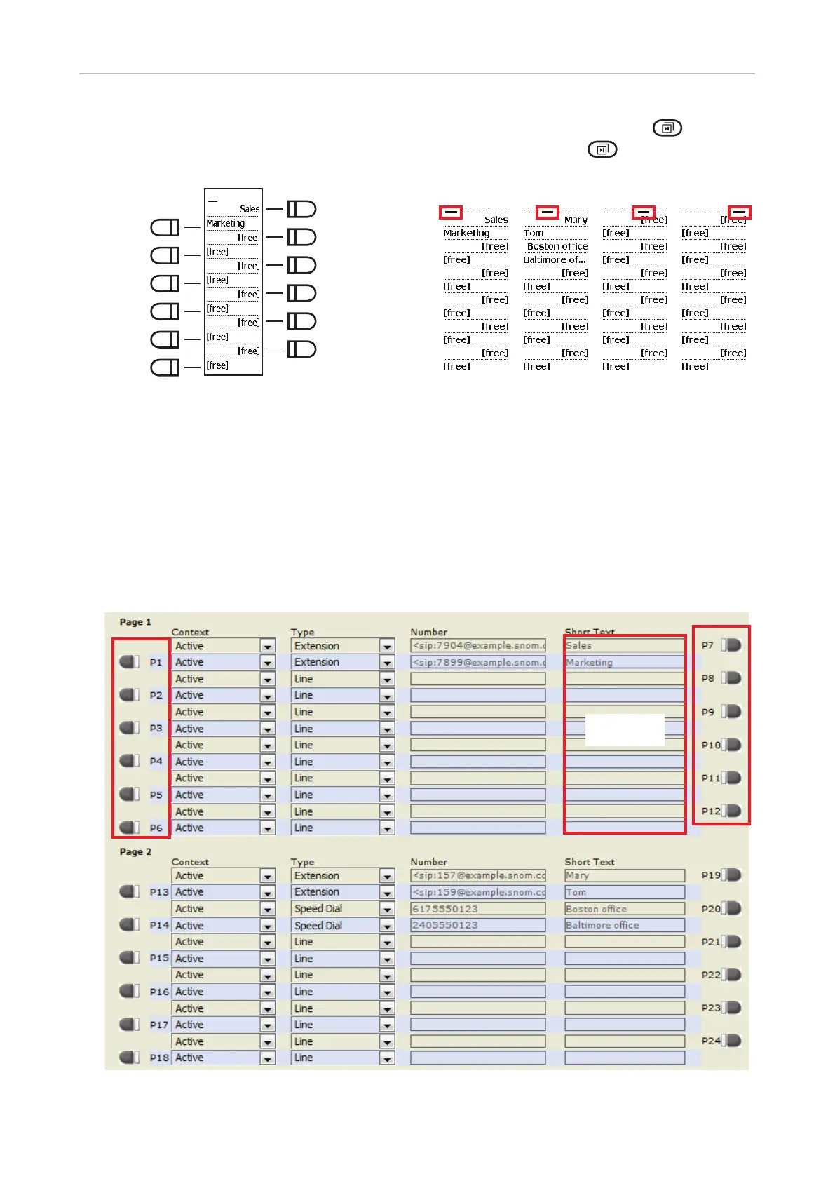 "Marketing", key P7 "Sales"; on page 2 key P13 is labeled "Tom", key P19 "Mary".
