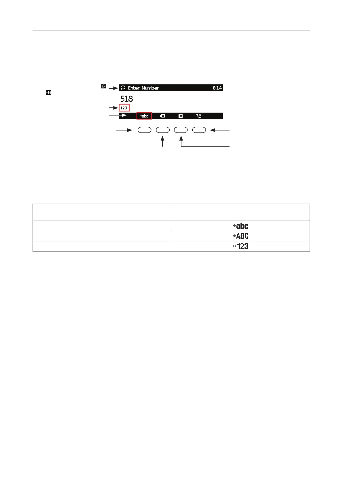 The current input mode is indicated underneath the cursor. Press the left function key underneath the
