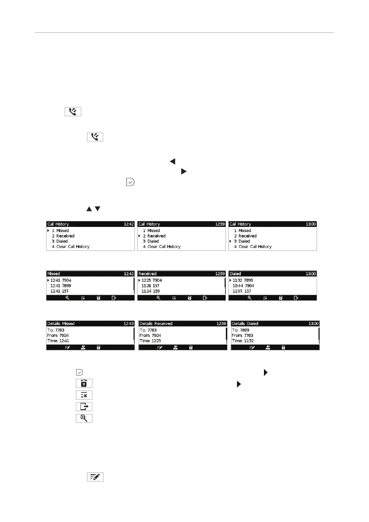 ◦ Press to dial the number of the selected call indicated by the arrow preceding the call.