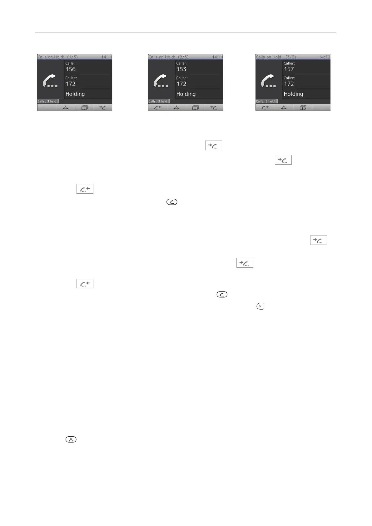 ◦ In Fig. H-4 the first held call of a total of three Calls on Hold (1/3) is on-screen. Press