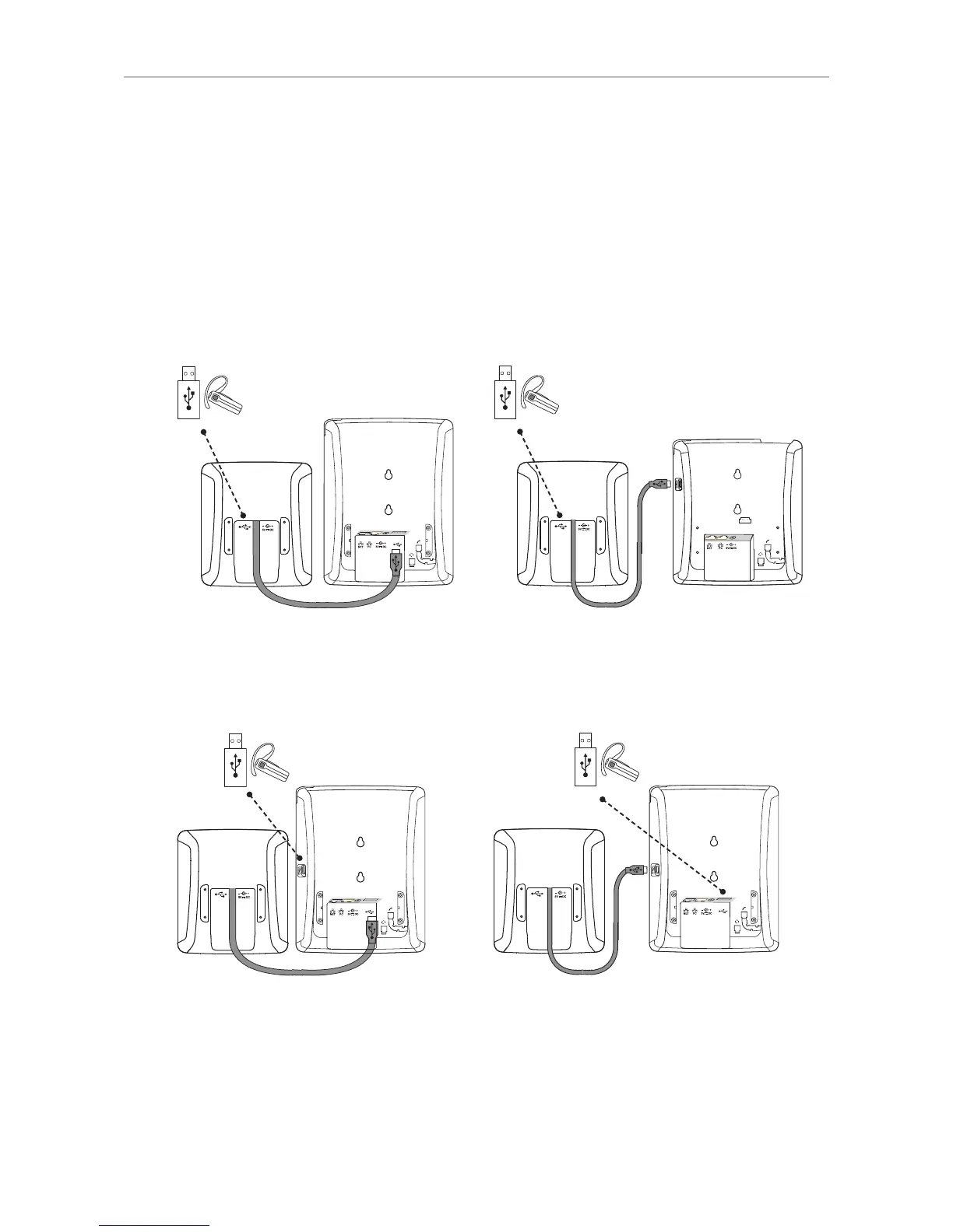 • Phone with single USB port. The USB adapter of the headset is inserted into the free USB port on