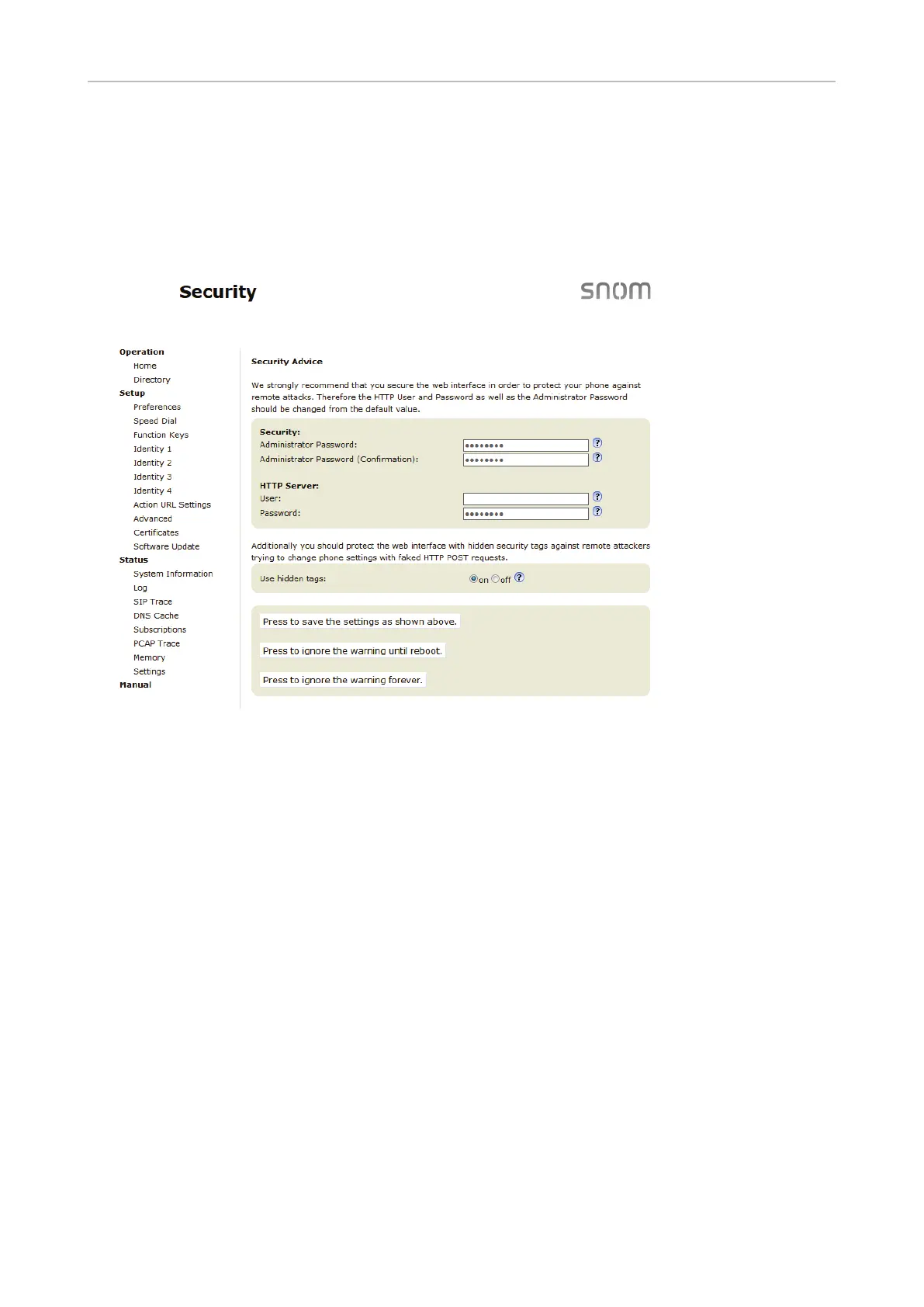 If you do not want to set an HTTP password, you can turn o the reminder on the phone’s display until
