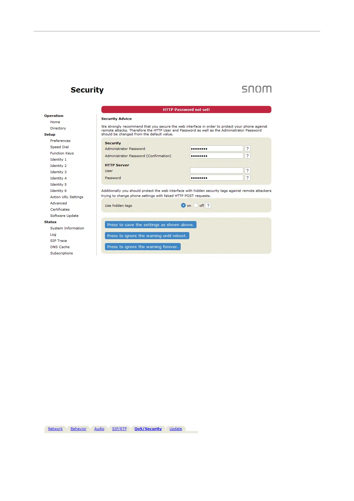 We urge you to set administrator and HTTP passwords to protect your phone. The default