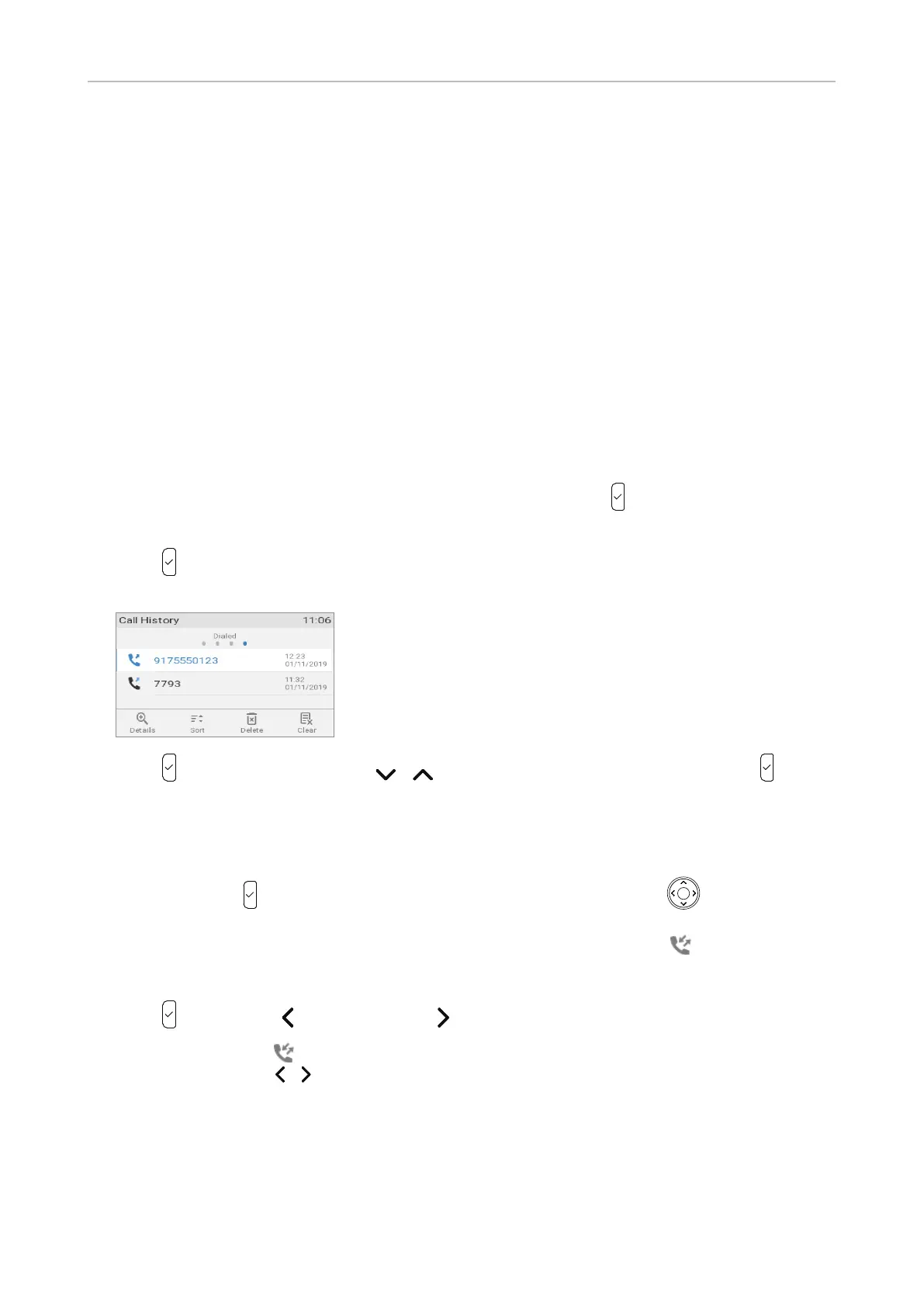 1. Press (dialed calls), (received calls), or (missed calls) to open the respective call list.
