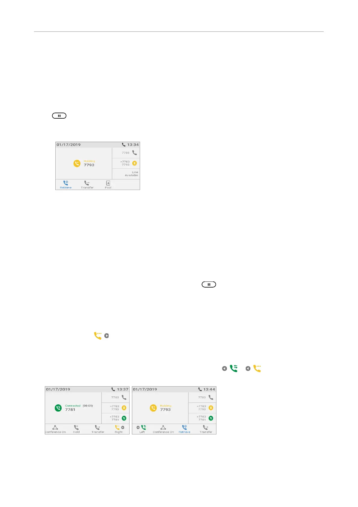 Press to put the ongoing call on hold. Held calls are indicated threefold: