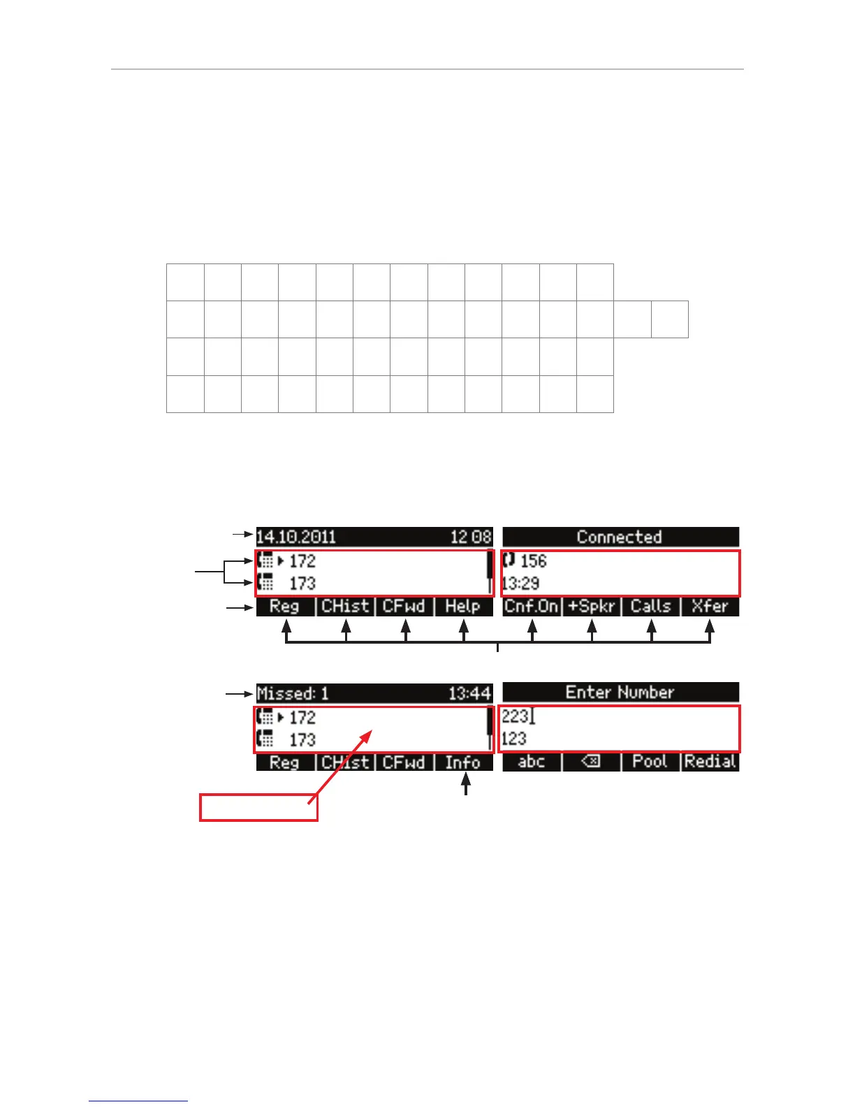 Info and status bar: The date and time are displayed in this line, unless there is a new status