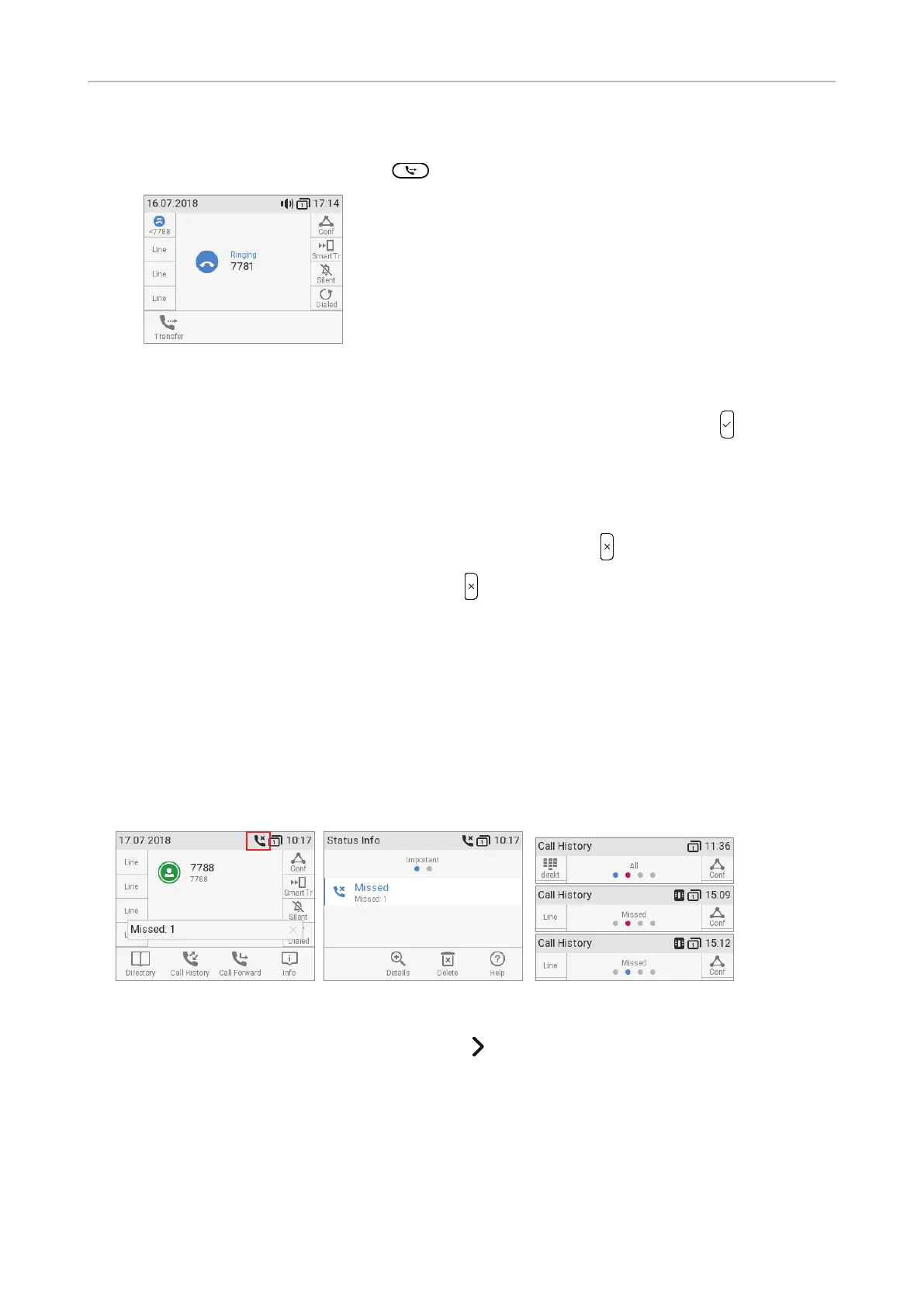 Missed calls are indicated by the call LED (steady light), the missed call symbol in the status line,