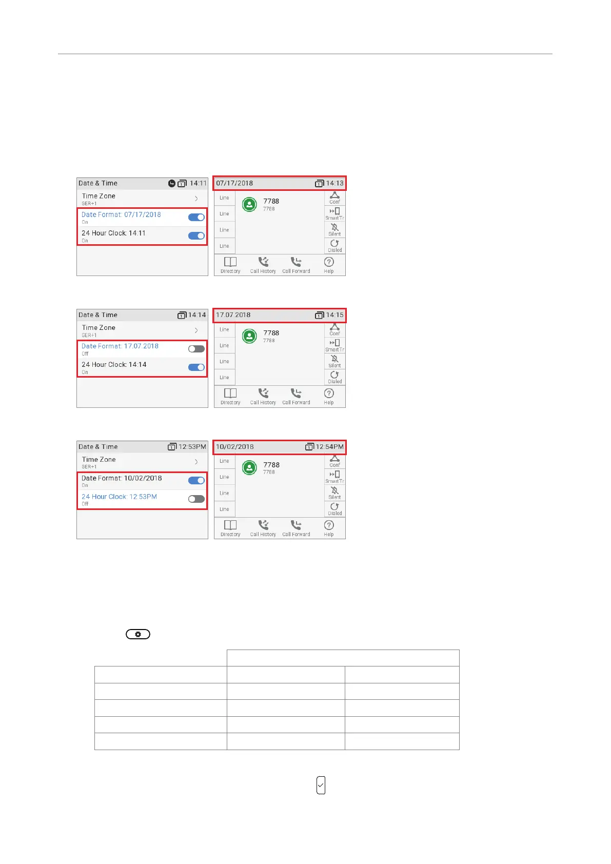 Date and time formats can be set on the phone and on the web interface. The defaults are US time