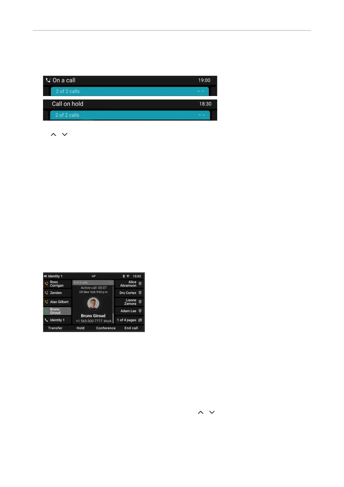 Press / to scroll through the calls. Your input on the phone's keys will affect the call on the