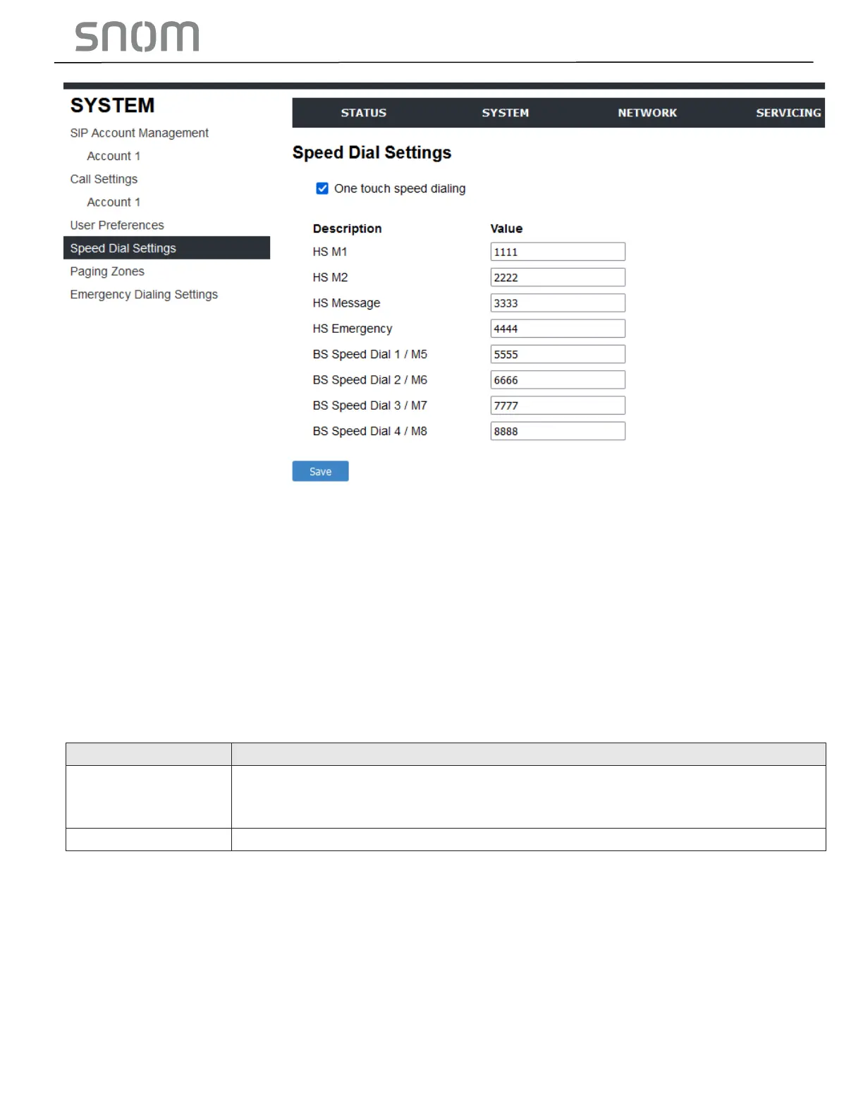 1. In the Value column, enter a phone number for the desired speed dial key.