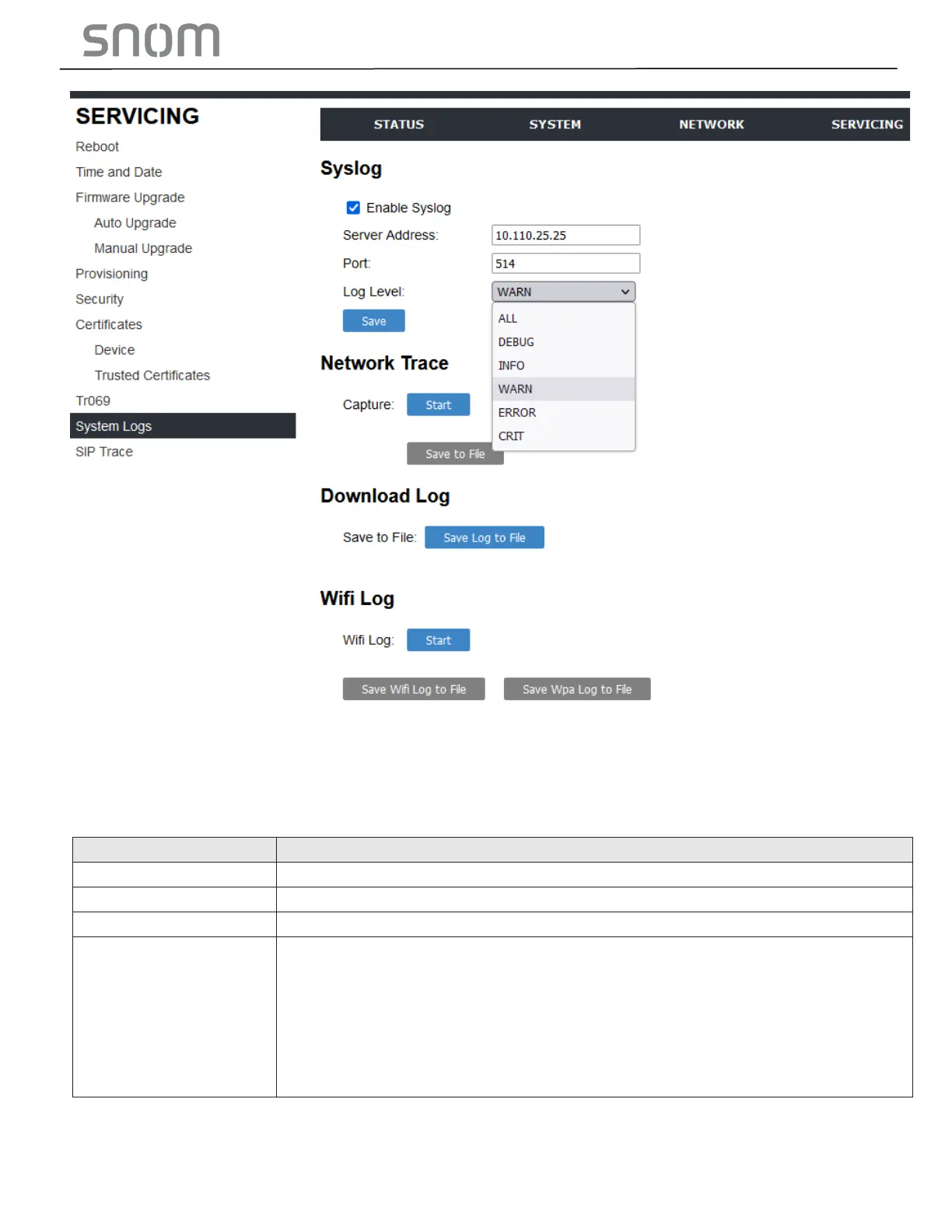 Snom HD100 - Syslog Settings
