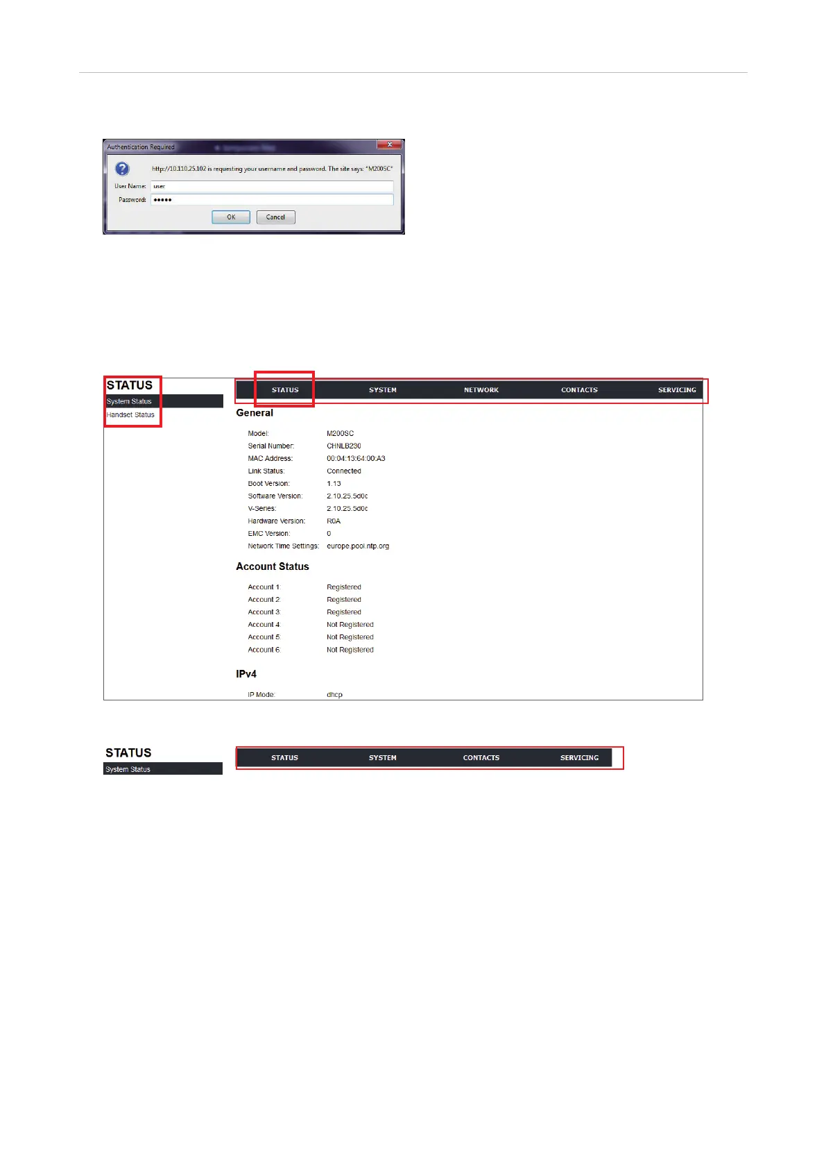 • Status. This menu has two pages, System Status and Handset Status, which contain information on your