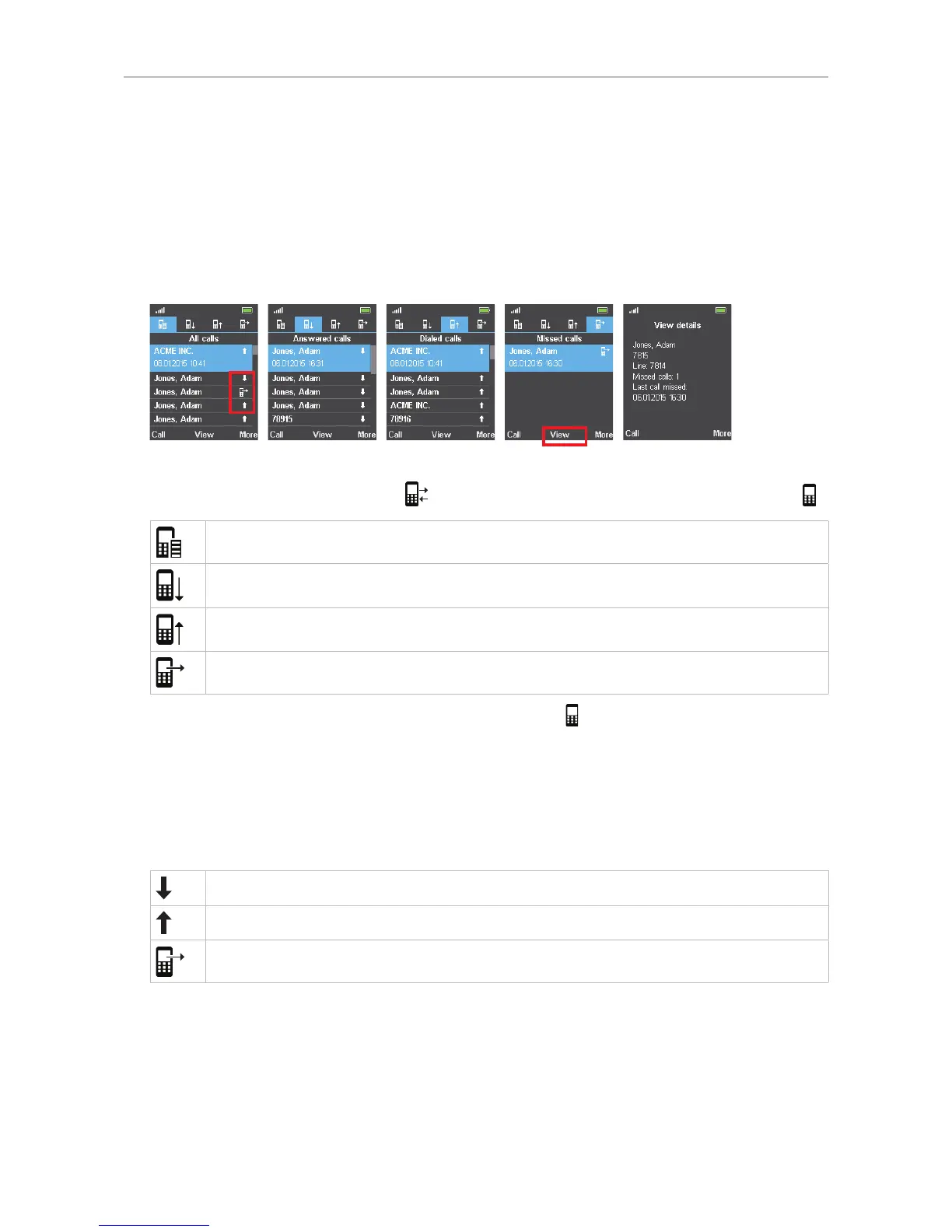 2. Press the function key underneath "View" (e.g., "Missed calls", Fig. 4) to view the call's details