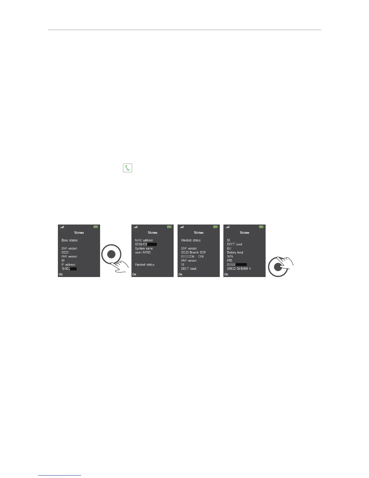 The status screen contains software and hardware information on the handset and on the base