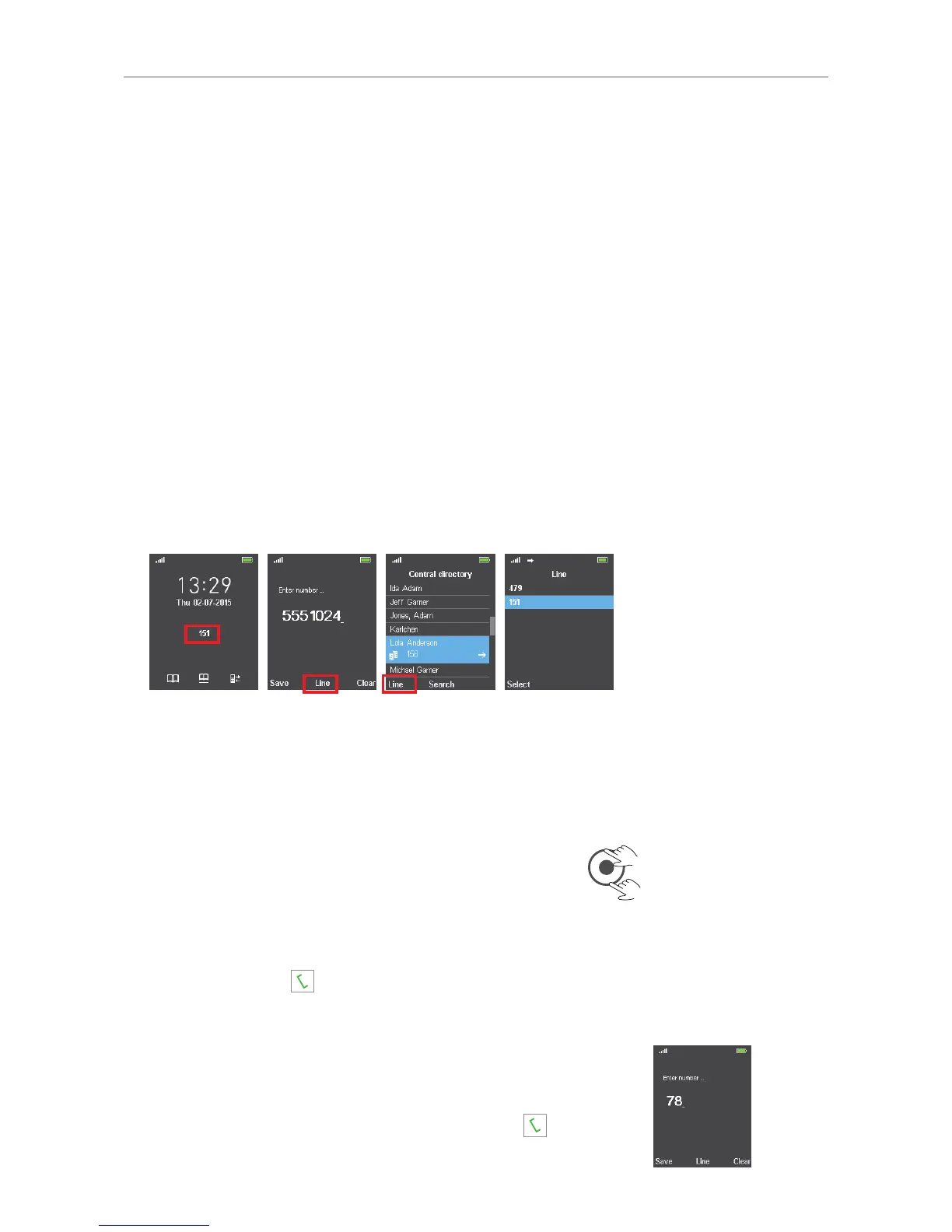 1. Before pressing the green key to dial a number, press the function key underneath Line.