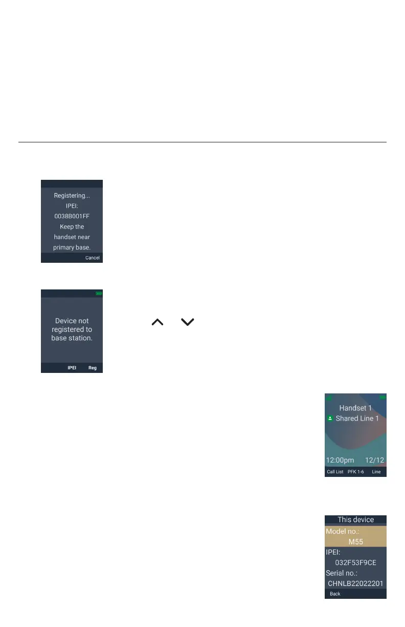 The handset beeps and displays “Handset registered”, and then