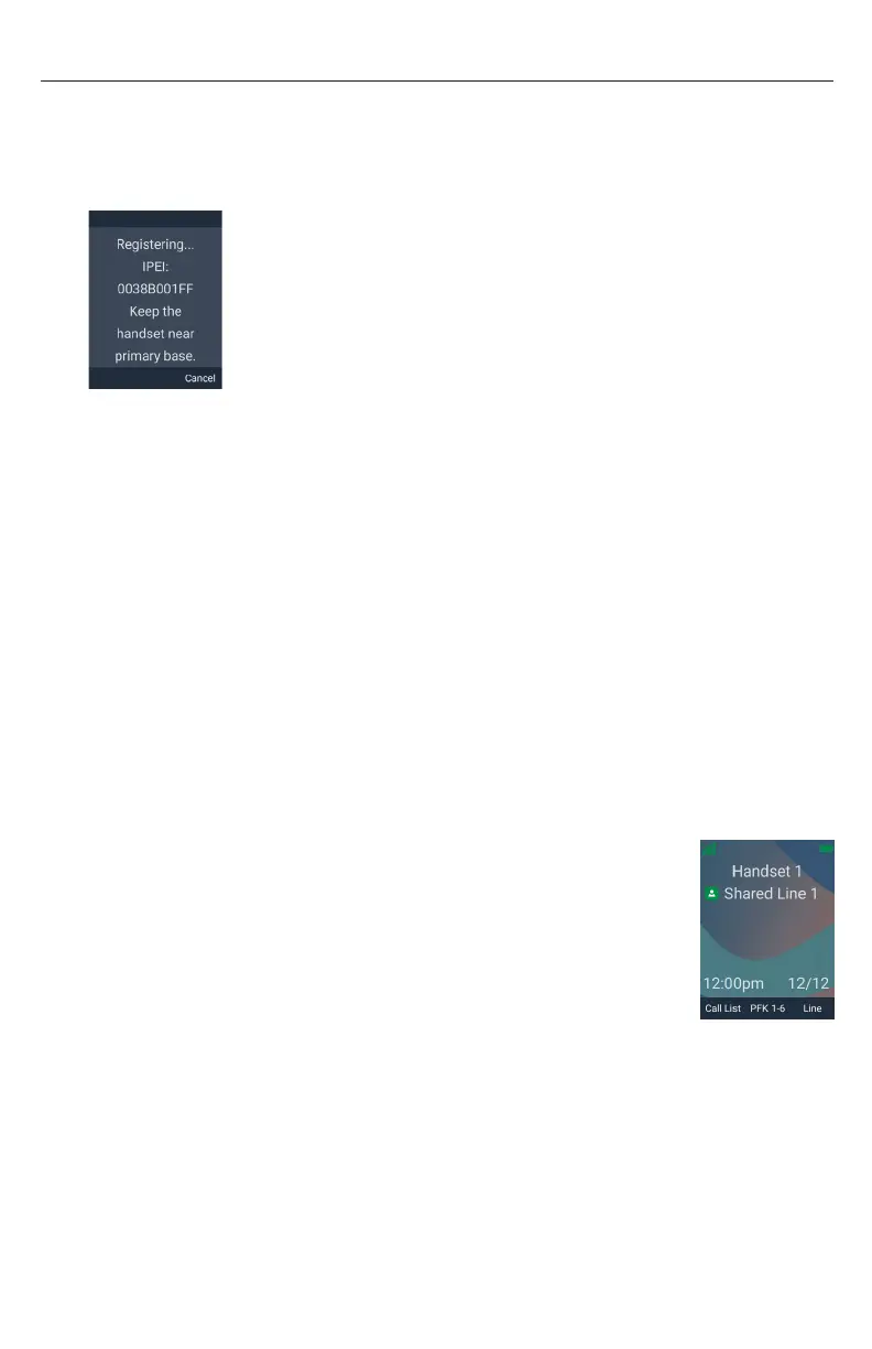 The handset beeps and displays “Handset registered”, and then